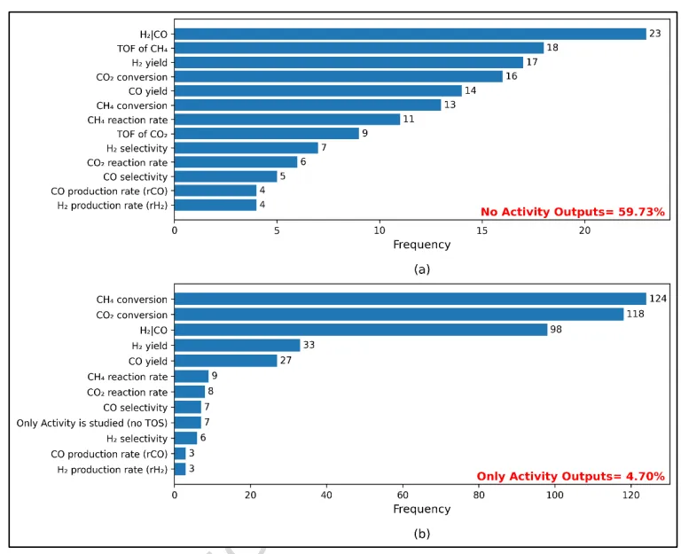 图1:DMR研究中报告的性能输出分布。图1a:展示了DMR研究中报告的与活性相关的指标频率。最常见的活性输出是H₂/CO比、CH₄的转化频率(TOF)和H₂产率,而CO和CH₄转化率的报告频率较低。图中红色文字显示,59.73%的研究未报告任何活性数据。图1b:展示了与稳定性相关的输出,包括CH₄转化率、CO₂转化率和H₂/CO比,这些指标在文献中占据主导地位。红色文字指出,仅有4.70%的研究仅关注催化活性而未进行稳定性评估。