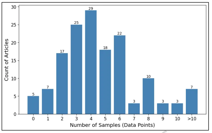 图2:每篇文章报告的样本数量(数据点)分布。该图展示了DMR研究中每篇文章报告的不同催化剂样本或数据点的数量。大多数研究每篇文章报告2到6个样本,其中报告4个样本的文章数量最多(29篇)。少数文章报告少于2个样本,而提供超过10个数据点的研究则更少。