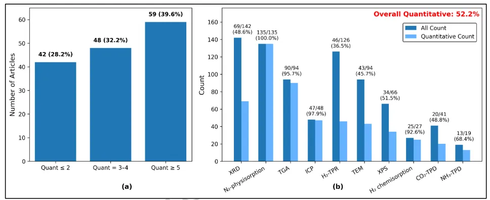 催化甲烷重整(DMR)的性能取决于金属、载体、助剂和合成方法,但目前数据报告的不一致性限制了研究结果的可重复性和可比性。在催化领域,多样化的材料、合成路线和测试条件使得数据的比较和重用变得复杂。标准化的数据格式对于数据挖掘和加速数据集准备至关重要,而缺乏标准化则需要重新处理数据,限制了基于文本的知识提取能力。此外,尽管大型语言模型(LLM)显示出潜力,但其应用仍受到成本和需要策划训练数据的限制。因此,开发标准化报告指南,涵盖表格格式、明确数量、供应商详细信息和完整程序,被认为是缓解机器可读性限制的一种方法。