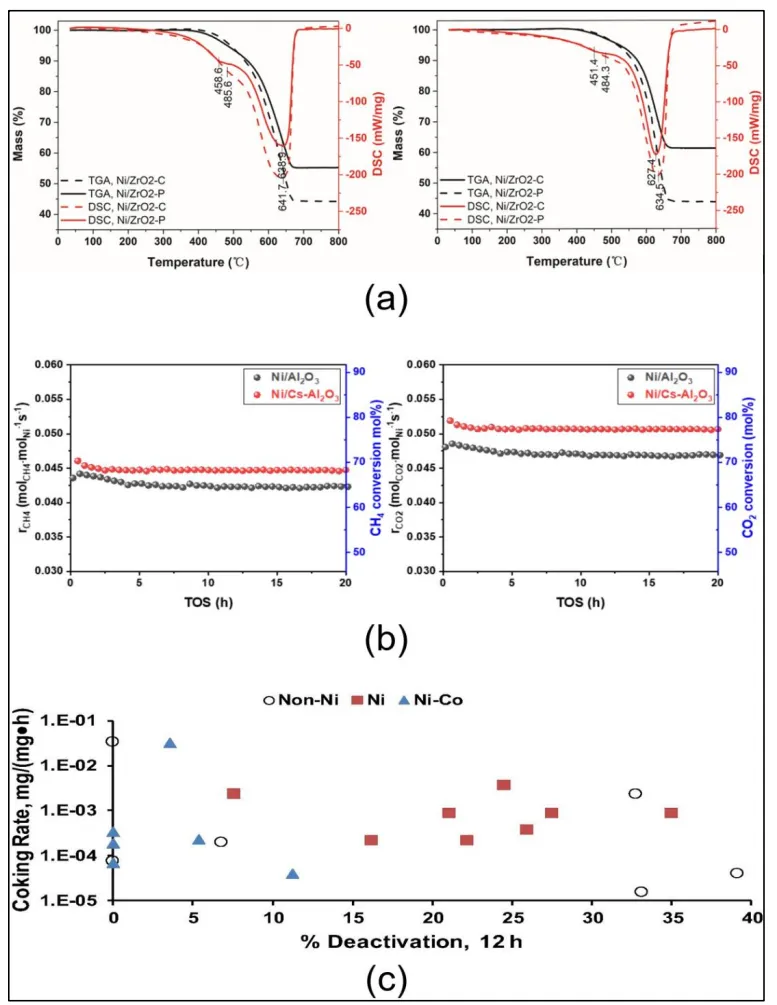 图5:DMR研究中与DFA相关的报告示例。图5a:展示了不一致的图例标签示例,同一样本在不同图表中使用不同的标识符,这使得解释复杂化,并阻碍了使用数字化工具进行自动化数据提取。图5b:展示了为同一数量报告多个单位的示例。如果定义了标准单位并清晰地说明了两种单位,则可以为更广泛的可访问性和可重复性提供帮助。图5c:展示了不具代表性的图表示例,该图表将催化剂失活与积碳形成联系起来,但未指定催化剂配方,从而无法准确提取积碳速率。