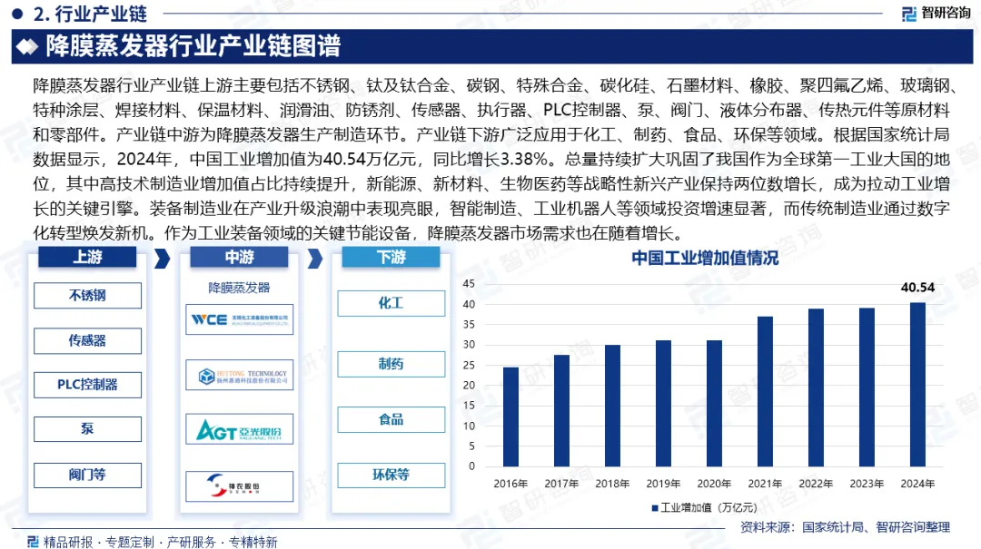 产业链核心节点:根据国家统计局数据显示,2024年,中国工业增加值为40.54万亿元,同比增长3.38%。总量持续扩大巩固了我国作为全球第一工业大国的地位,其中高技术制造业增加值占比持续提升,新能源、新材料、生物医药等战略性新兴产业保持两位数增长,成为拉动工业增长的关键引擎。装备制造业在产业升级浪潮中表现亮眼,智能制造、工业机器人等领域投资增速显著,而传统制造业通过数字化转型焕发新机。作为工业装备领域的关键节能设备,降膜蒸发器市场需求也在随着增长。