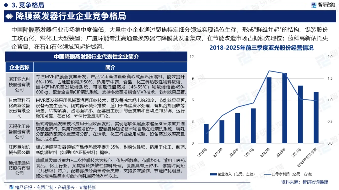 竞争情况:中国降膜蒸发器行业市场集中度偏低,大量中小企业通过聚焦特定细分领域实现错位生存,形成"群雄并起"的结构。锡装股份主攻石化、煤化工大型装置;广厦环能专注高通量换热器与降膜蒸发器集成,在节能改造市场占据领先地位;蓝科高新依托央企背景,在石油石化领域筑起护城河。