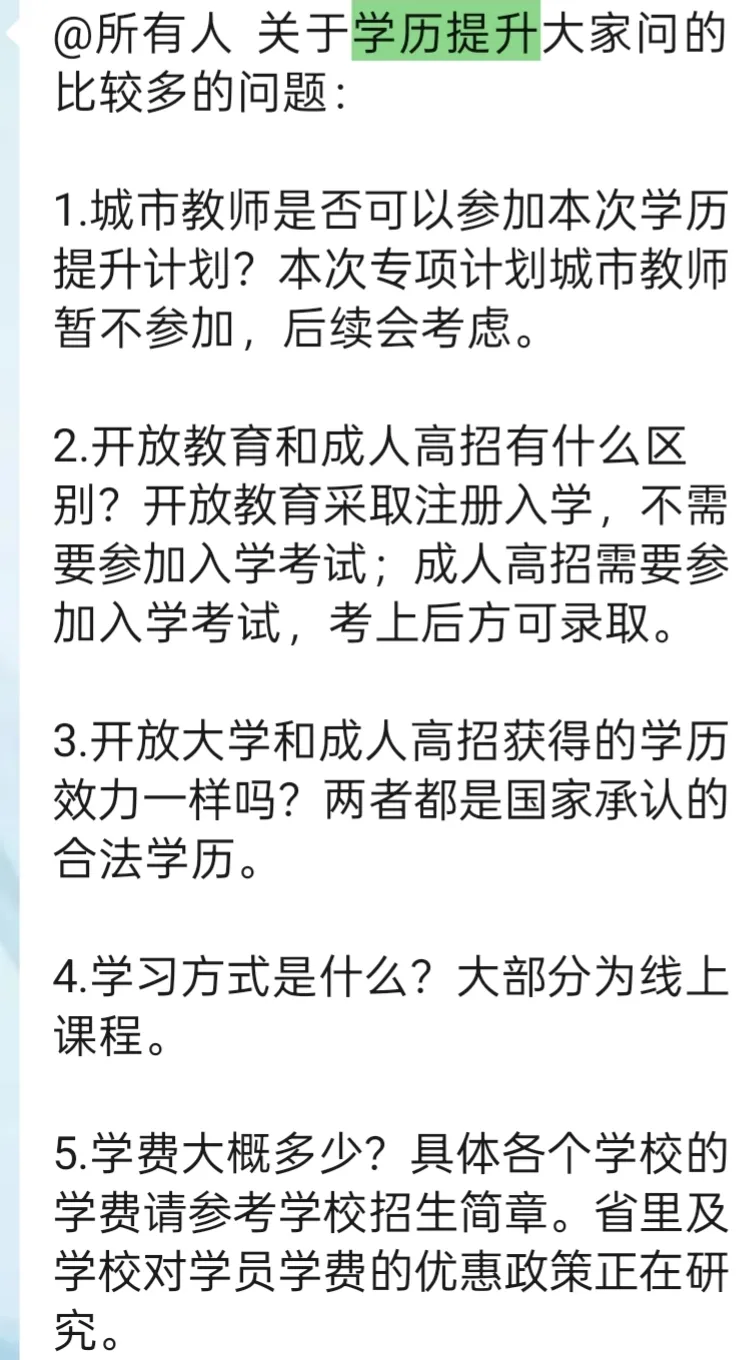 以上出自报告原文。就我自己的意愿来说,若是可以,提升一下自己的学历,从本科提升到研究生学历,也是一件好事!针对教师学历提升愿望强烈的要求,我所知道的:河南省已经在行动,今年的相关通知已发,不过这个主要是针对义务教育阶段乡镇及农村教师,提升的也主要是“专升本”学历。相信随着这个工作的持续推进,慢慢的城市教师也是会允许的。随着社会的发展,本升硕学历提升计划也会逐渐展开,对此,我还是比较乐观看待的!这个学历提升学费的解决,目前河南省尚未有明确的措施,只是说优惠政策正在研究,我认为:一是整合人力资源和社会保障部门的相关技能培训经费,让教师学历提升纳入相关的技能提升范畴,采取部分补贴;二是统筹安排教育培训经费,将教师学历提升纳入继续教育培训计划,适当给予学费补贴,将学历提升学习经历纳入继续教育学时学分认定,减轻学历提升教师培训负担;三是鼓励高校减免部分学费或适当降低学费,同时省教育厅采取公开招标的方式,确定承办此项目的全国高校;四是出台相关措施,利用学龄儿童减少的有利时机,积极鼓励及要求各中小学支持此项工作,同时将其纳入相关工会工作计划,利用工会会费适当补贴学费;五、鼓励企事业单位及社会捐助,教师节前开展“我为教育事业慈善捐款”活动,或政府倡导的每年慈善一日捐活动,将其收入专门用以此项目的支出,同时向社会公开收支情况,接受社会监督;六是鼓励福彩、体彩等公益组织开展相关的公益支持项目;七是教师个人出资缴纳一部分学费;八、财政支出,适当增加,增资部分用于此项支出。若是这八条措施都形成合力支持,较大范围及更高学历提升计划实施还是可行的。