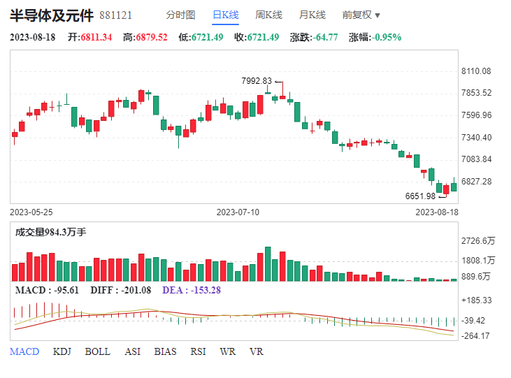 今天半导体及元件指数报6721.49点,下跌-0.96%,盘中最低下探6721.49点,最高上冲6879.52点,成交额325.84亿元。(来源:同花顺)