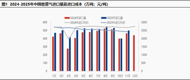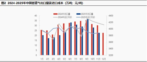 12月,中国天然气进口量预计在470万吨附近,环比降幅6.16%;出口量预计在21万吨附近,环比降幅7.16%。从需求端来看,12月国内气温整体偏暖,与往年同期相比,北方地区集中供暖负荷未出现明显攀升,城燃分销及电厂调峰采暖等传统刚需领域的用气需求较上月基本持平,未形成增量支撑。与此同时,南方地区部分生产型企业进入年末停工备货阶段,工业生产线开工率有所下滑,叠加前期原料及能源库存充足,工业用气需求呈现小幅回落迹象,进一步削弱了天然气市场的整体消费动力。