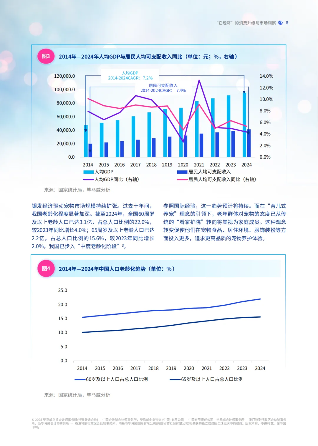 从市场规模来看,2024 年中国城镇犬猫市场规模超 3000 亿元,预计 2027 年有望突破 4000 亿元;宠物相关业务市场规模 2025 年将达 8114 亿元,年复合增长率保持高位。