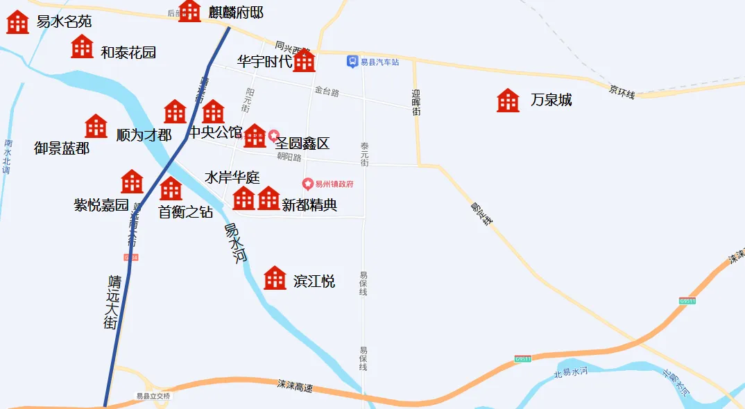 根据不完全统计,目前易县市场上有10多个项目在售,其中首衡之钻、滨江悦等项目在一段时间内受到市场热捧,而其它在售项目如华宇时代、紫悦嘉园、御景蓝郡等也完成交房,但受到前些年市场粗犷发展的影响,也仍然有类似和泰花园(原易州新城项目)的解疑项目等待交付。