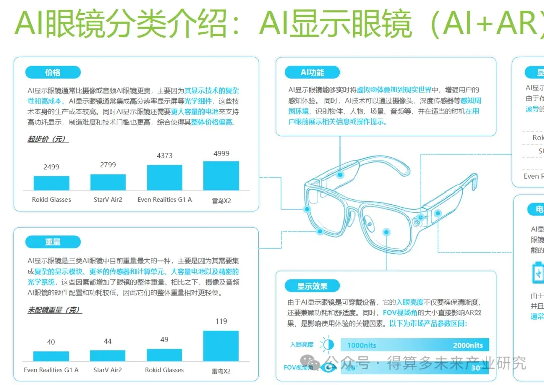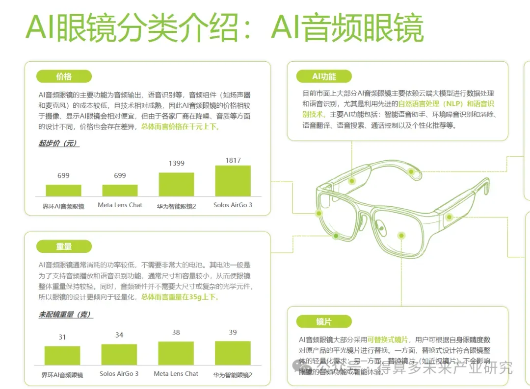 AI眼镜是一种创新型可穿戴设备,其在传统眼镜产品的基础上增加了人工智能技术,并将音频、摄像等功能集成于一体而成。对于AI眼镜而言,人工智能属性是其最核心的属性。在此基础上,根据集成的技术或硬件类型又可以细分为五大类型,每种类型的适用场景、适用人群存在一定差异性,但共同点在于AI眼镜为用户的工作、生活带来了效率的提升或是体验的改善。