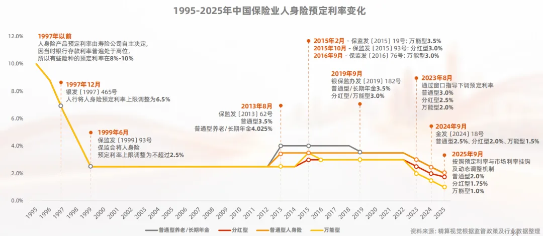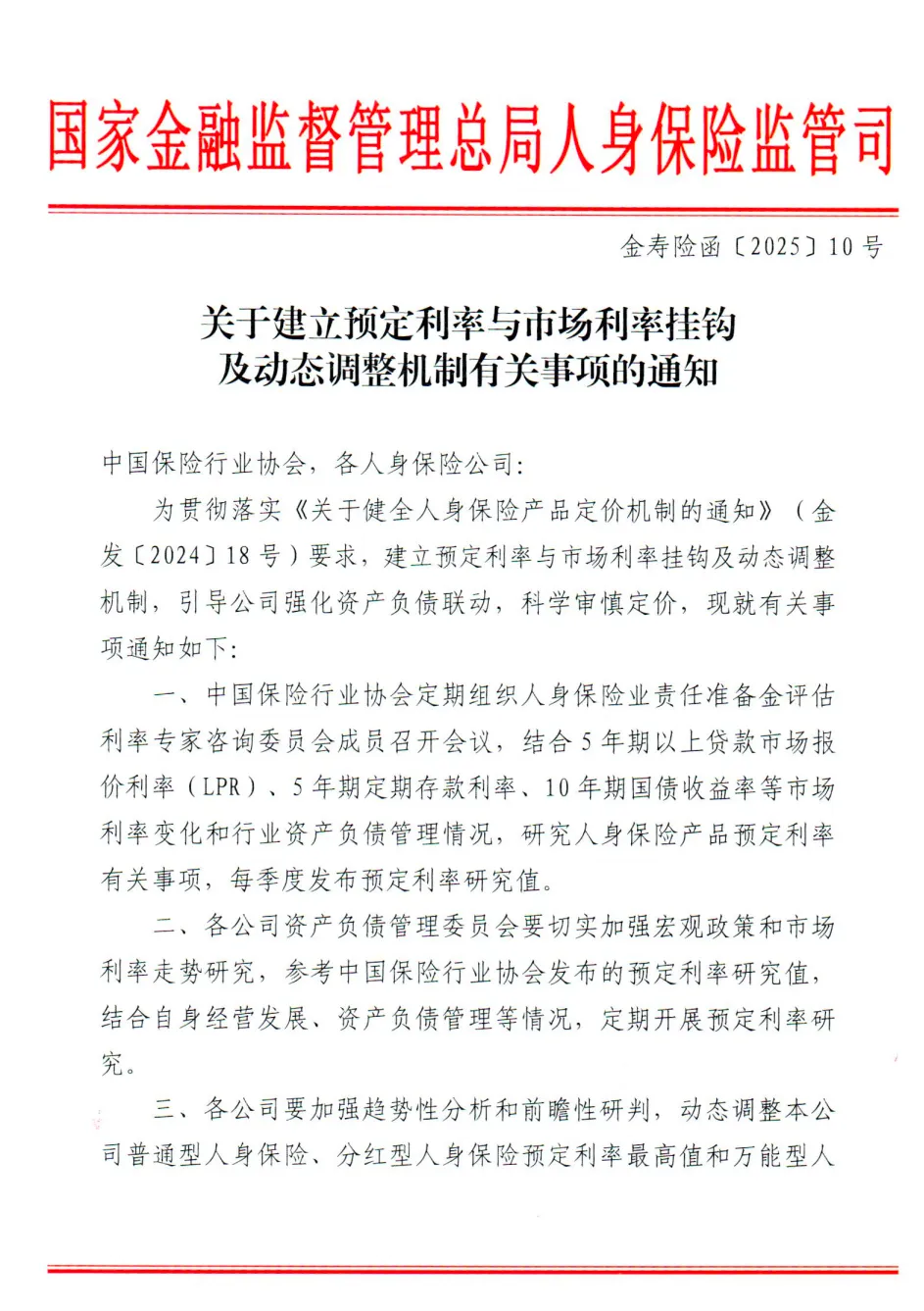 从时间线来看,先是2025年1月,金融监管总局下发《关于建立预定利率与市场利率挂钩及动态调整机制有关事项的通知》,明确了中国保险行业协会每季度发布的人身险产品预定利率研究值作为调整依据。