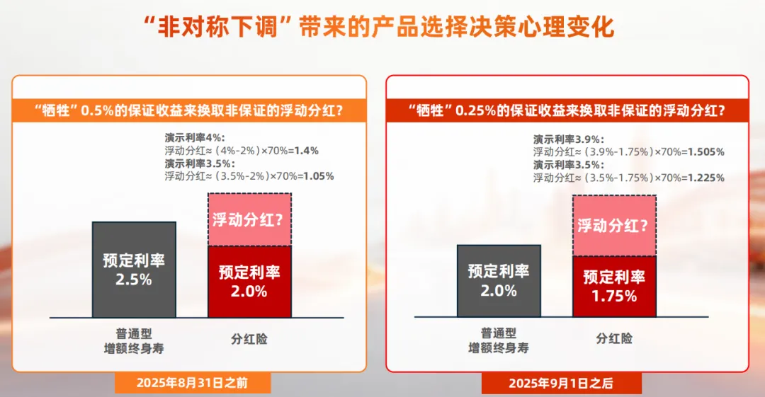 本次预定利率的下调,采取了“非对称性”原则,是会为客户朋友以及我们营销伙伴的产品决策带来一些心理上的变化,2025年8月31日之前,消费者需要在是否要“牺牲”0.5%的保证收益来换取1.05%-1.4%的非保证浮动分红之间做出选择;