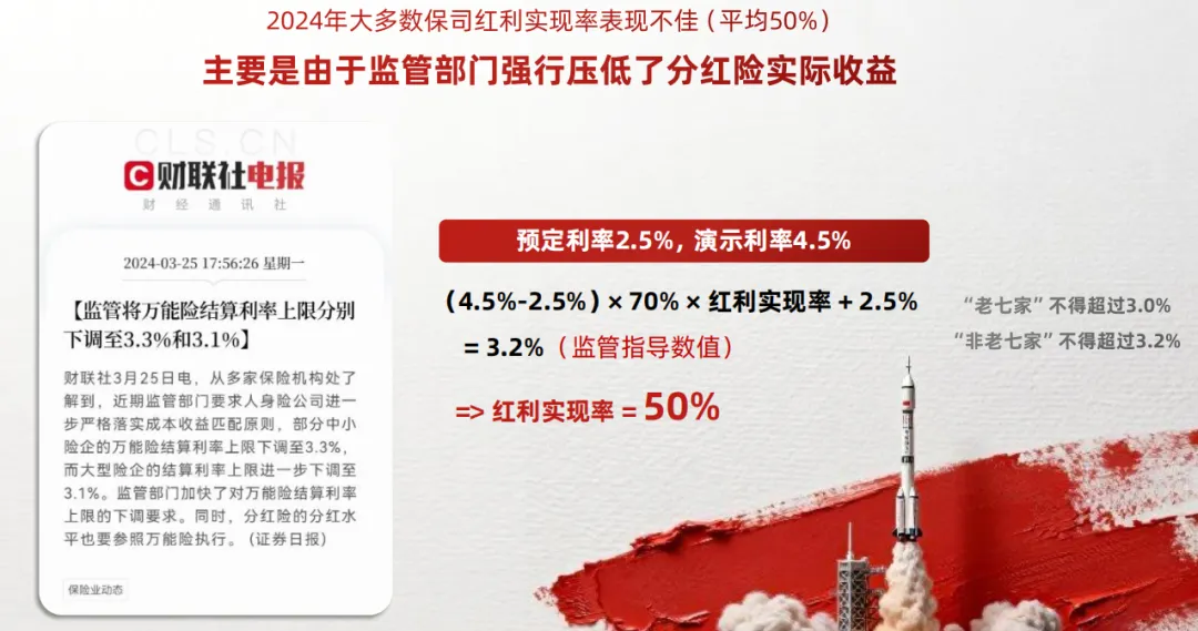 2024年年初,监管部门由于对于当时保险行业的投资环境非常担忧,于是主动去万能险产品和分红险产品给客户的收益率做了“限高”,要求“老七家”的万能险结算利率不得超过3.1%,“非老七家”不得超过3.3%;而分红险的客户收益率,“老七家”不得超过3.0%,“非老七家”不得超过3.2%。
