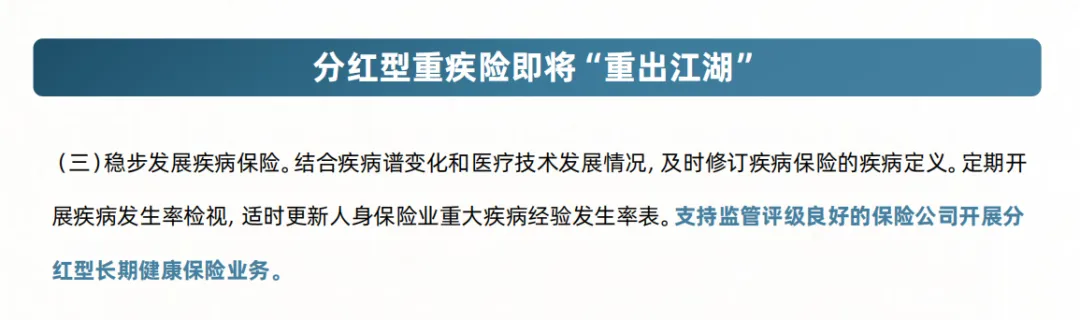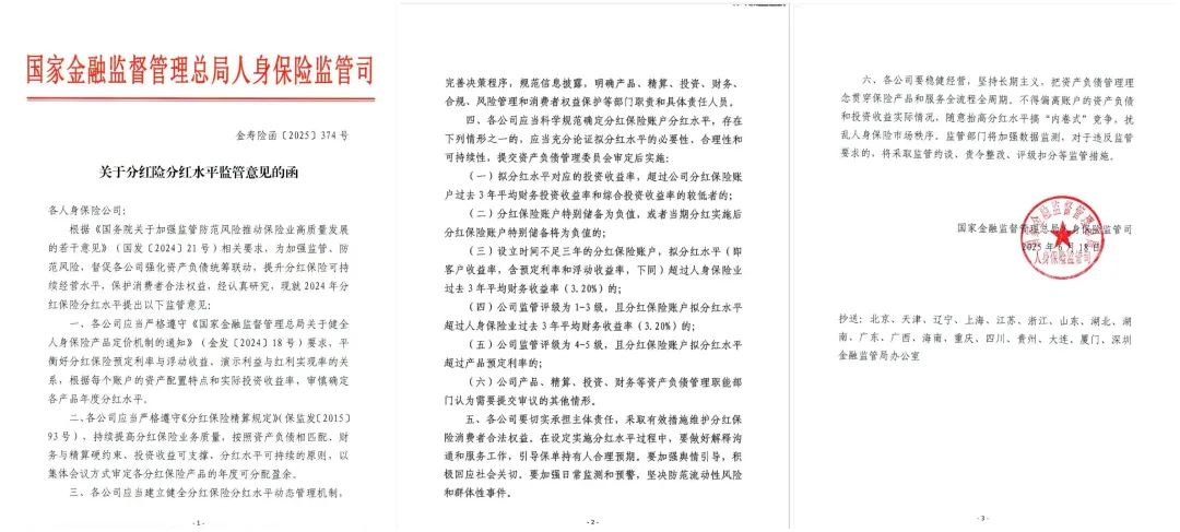 伴随着资本市场的回暖以及监管对于推动行业建立向分红险转型的信心,2025年6月18日,国家金融监督管理总局人身险监管司发布《关于分红险分红水平监管意见的函》,对分红险分红水平设定了原则性框架规则,允许投资实力强、公司评级高的保险公司单独向监管申请突破现有限高规则。