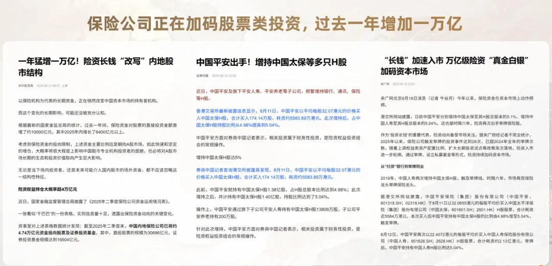 2025年1月22日:中央金融办等六部门印发《关于推动中长期资金入市工作的实施方案》,要求大型国有保险公司每年新增保费中至少30%用于投资A股。 2025年4月8日:国家金融监督管理总局发布《关于调整保险资金权益类资产监管比例有关事项的通知》,上调权益类资产配置比例上限。金融监管总局上调部分档位偿付能力充足率对应的权益类资产比例上限5%,提高创业投资基金集中度比例。 2025年7月11日:财政部发布《关于引导保险资金长期稳健投资,进一步加强国有商业保险公司长周期考核的通知》,增加五年周期考核指标。 2025年12月5日:国家金融监督管理总局发布《关于调整保险公司相关业务风险因子的通知》,进一步下调长期持仓股票的风险因子,降低资本占用成本。
