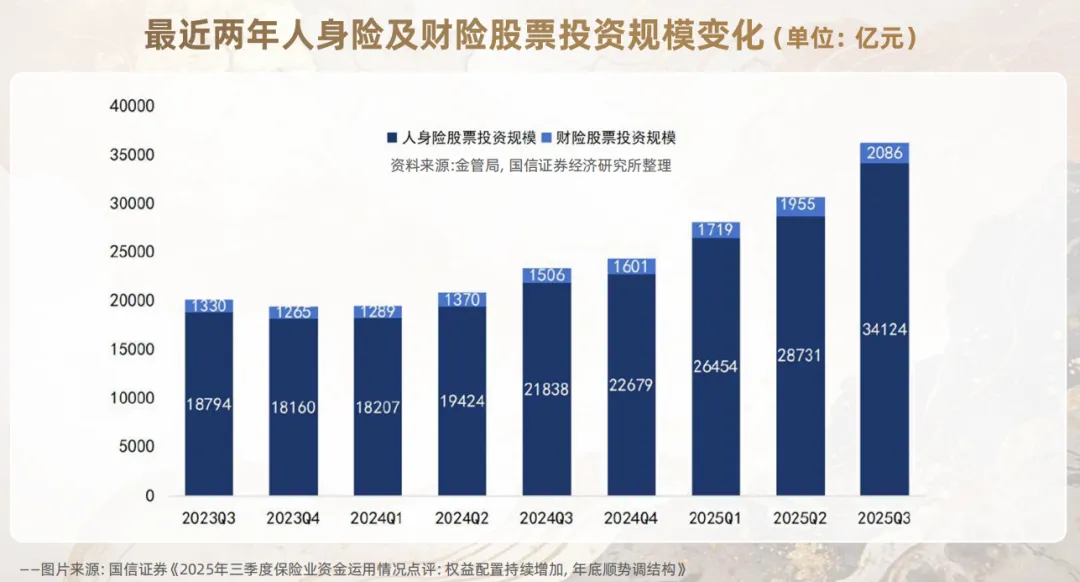 政策红利下,险资权益配置比例创下历史新高,截至三季度末,人身险公司和财产险公司股票和基金配置余额达5.59万亿元,同比增长35.92%,合计配置比例超15%。
