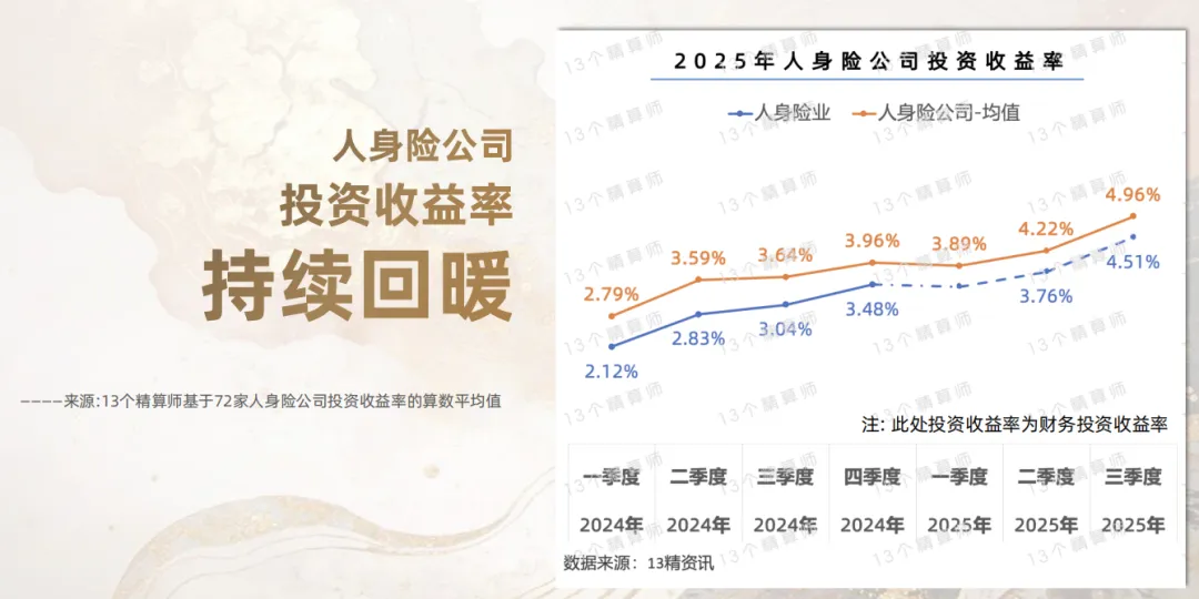 据统计,72家人身险公司投资收益率的算数平均值,人身险公司财务投资收益率从2024年一季度的2.79%回升至2025年三季度的4.96%。
