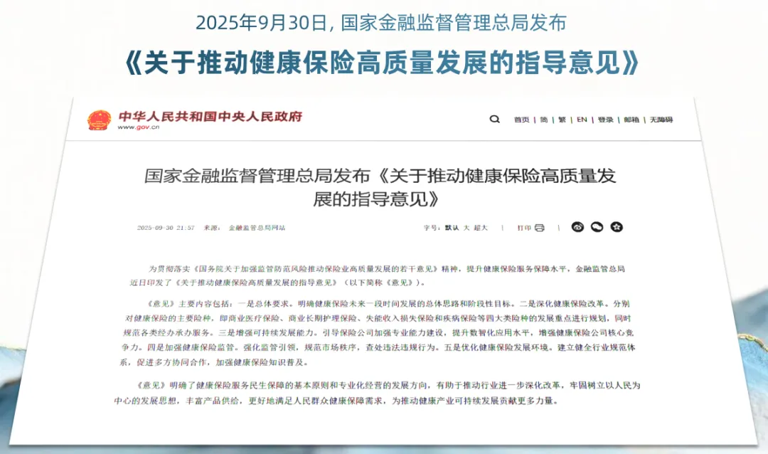 2025年9月30日,国家金融监督管理总局发布《关于推动健康保险高质量发展的指导意见》,我把文件中对于产品发展有导向性作用的四个重点为大家总结出来