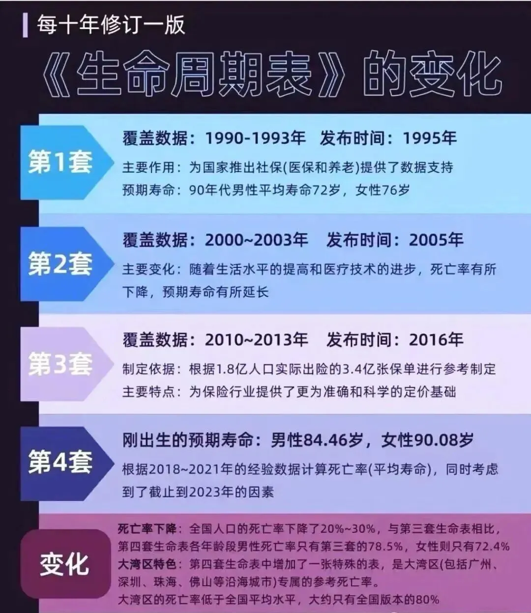 每隔10年,随着人口的死亡率和预期寿命发生改变,都会更新换代。第三套生命表是2016年更新的,距今已有9年。