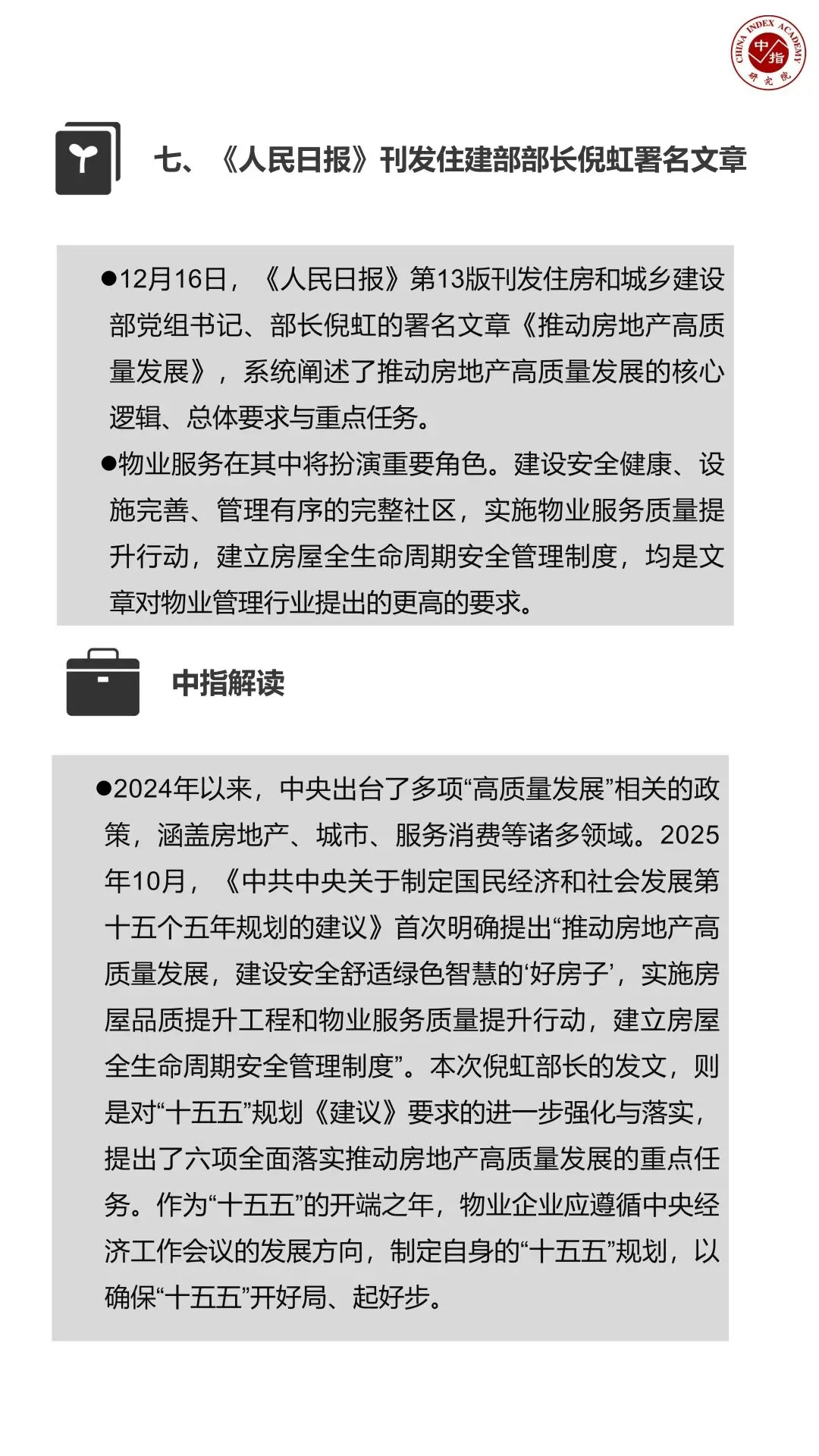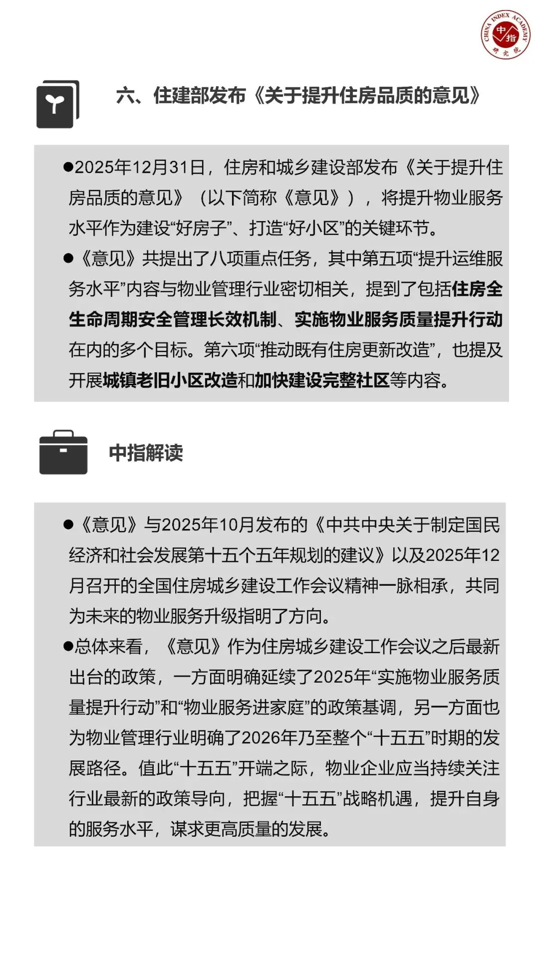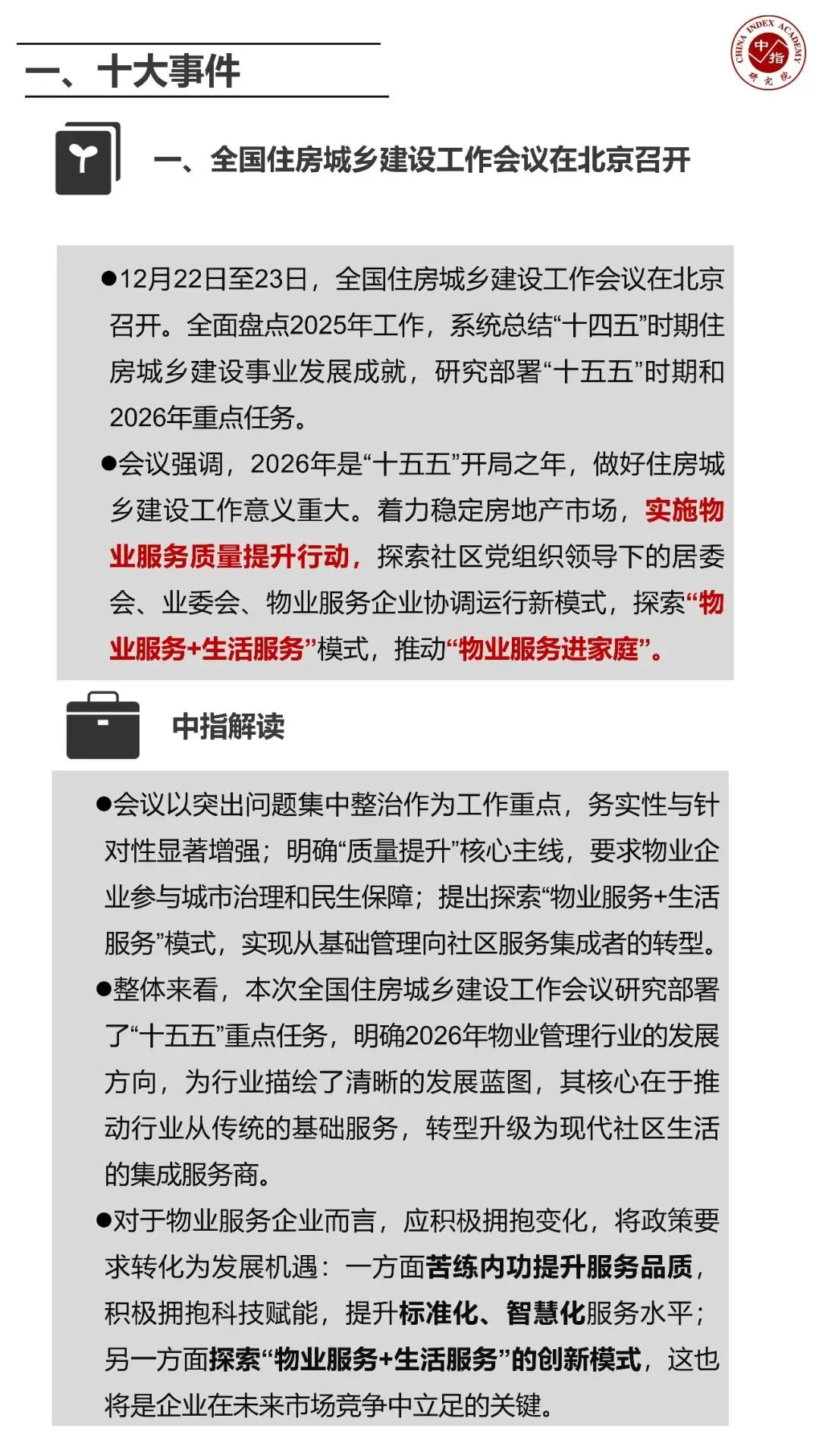 l会议强调,2026年是“十五五”开局之年,做好住房城乡建设工作意义重大。着力稳定房地产市场,实施物业服务质量提升行动,探索社区党组织领导下的居委会、业委会、物业服务企业协调运行新模式,探索“物业服务+生活服务”模式,推动“物业服务进家庭”。