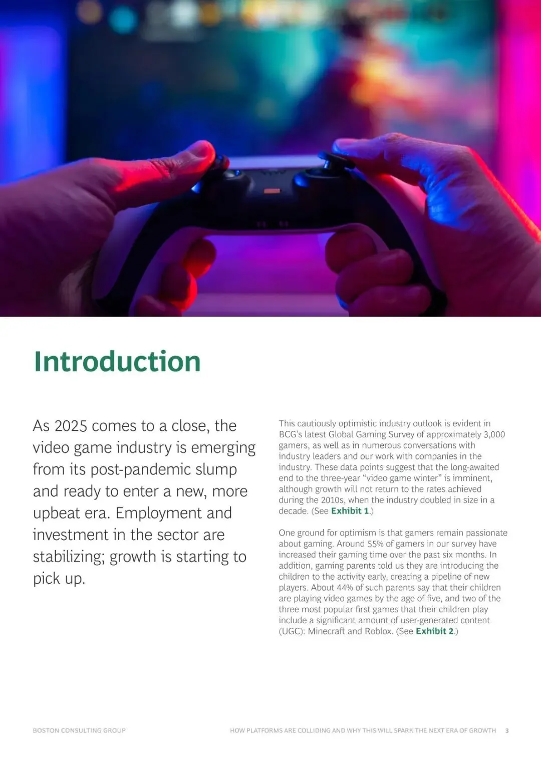 这份波士顿咨询公司(BCG)发布的《2026 视频游戏行业报告》分析了全球游戏行业的现状与未来趋势,指出行业正在走出“疫情后低迷”,步入一个由四大战略趋势驱动的新增长时代。报告基于对近 3,000 名玩家的调研数据撰写。核心内容摘要如下: