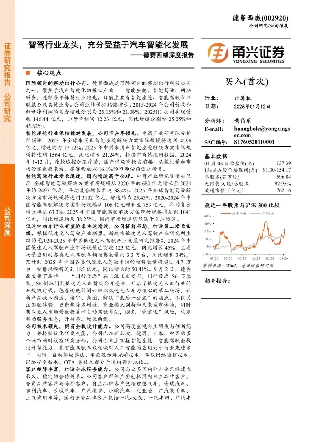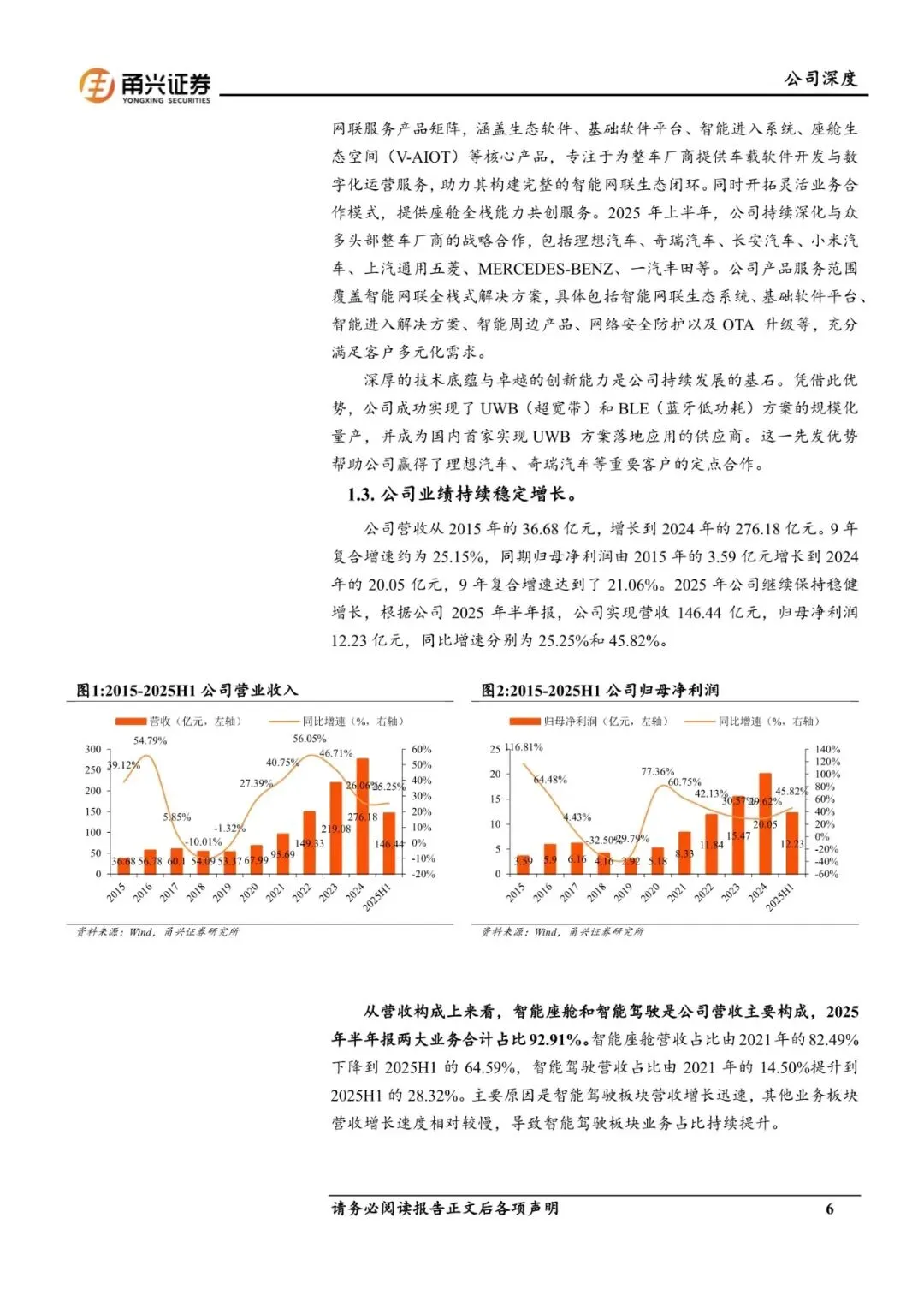 德赛西威是国际领先的移动出行科技公司之一,聚焦于汽车智能化的核心产业——智能座舱、智能驾驶、网联服务,连续多年保持行业领先。目前主要有智能座舱、智能驾驶和网联服务及其他业务。公司业绩保持稳健增长。2015-2024年公司营收和归母净利润的复合增速分别为25.15%和21.06%。2025H1公司实现营收146.44亿元,归母净利润12.23亿元,同比增速分别为25.25%和45.82%。