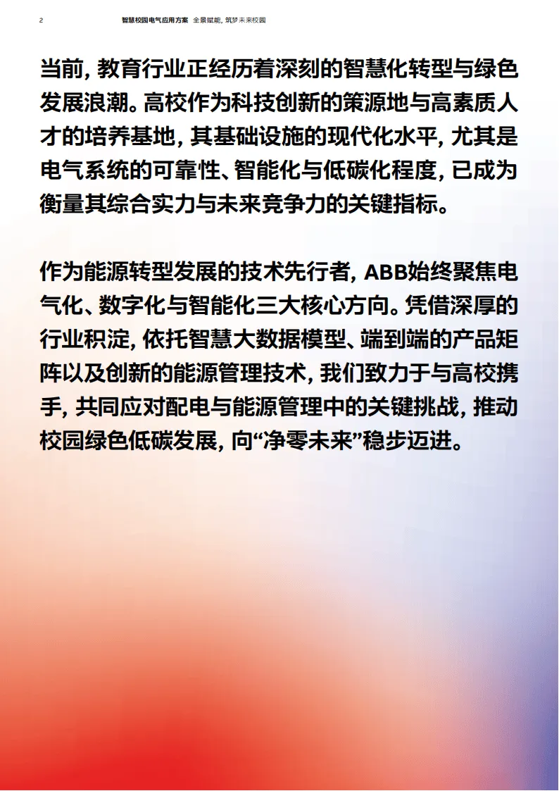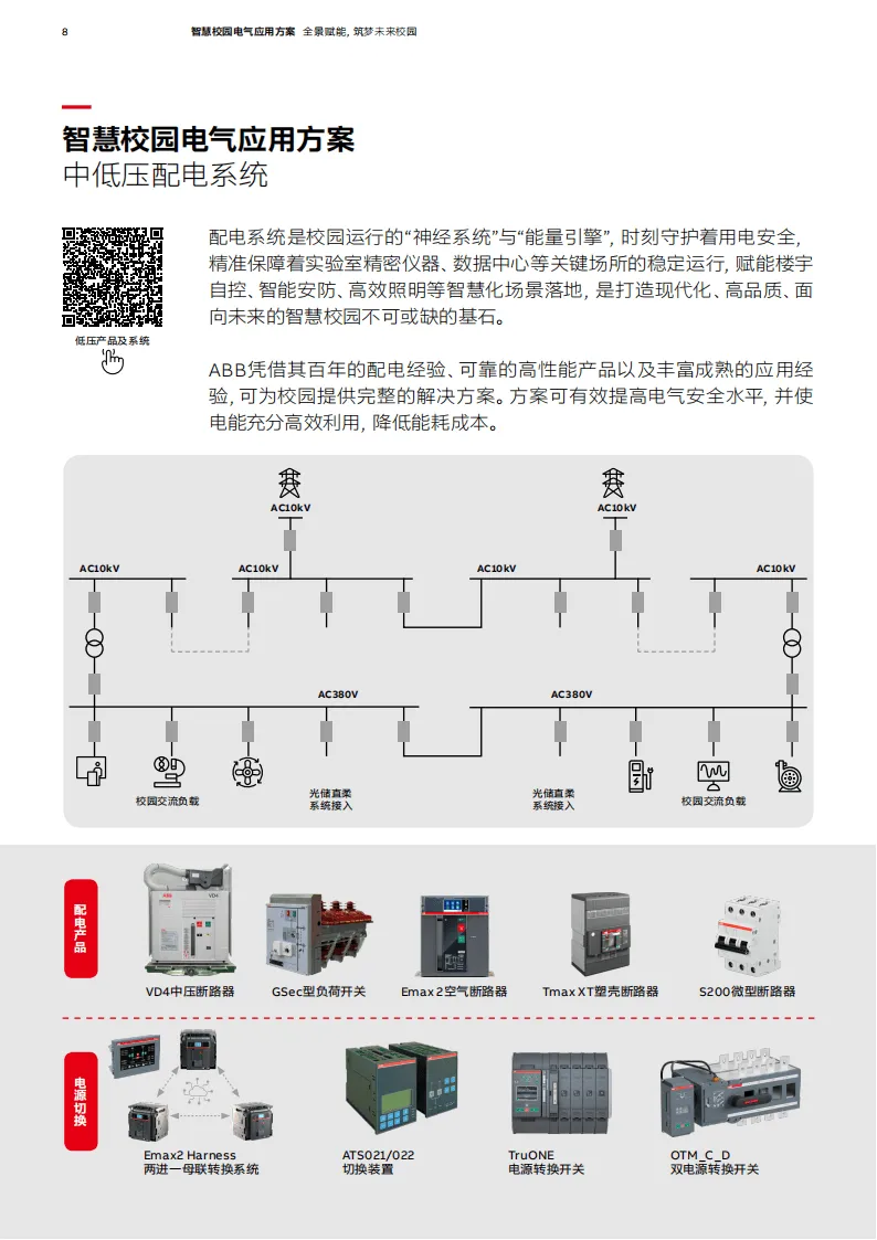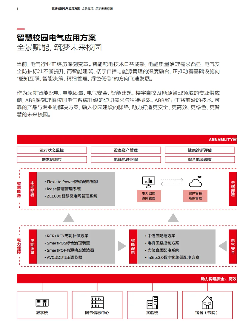 在教育行业智慧化转型与绿色发展的浪潮下,高校电气系统的可靠性、智能化与低碳化成为衡量其综合实力的关键。ABB聚焦电气化、数字化与智能化核心方向,凭借深厚行业积淀与创新技术,推出智慧校园电气应用方案,全方位赋能未来校园建设。