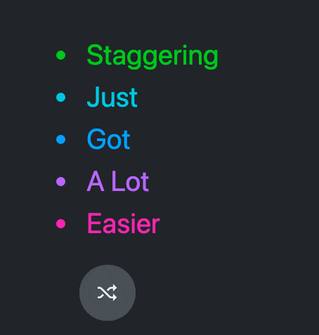li {transition: opacity 0.3s ease;transition-delay: calc((sibling-index() - 1) * 100ms);}这个函数会自动获取元素在兄弟节点中的位置(从 1 开始计数),通过简单的计算就能实现流畅的交错动画效果。