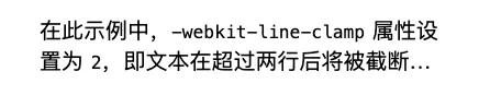 p {width: 300px;display: -webkit-box;-webkit-box-orient: vertical;-webkit-line-clamp: 2;overflow: hidden;}效果如下: