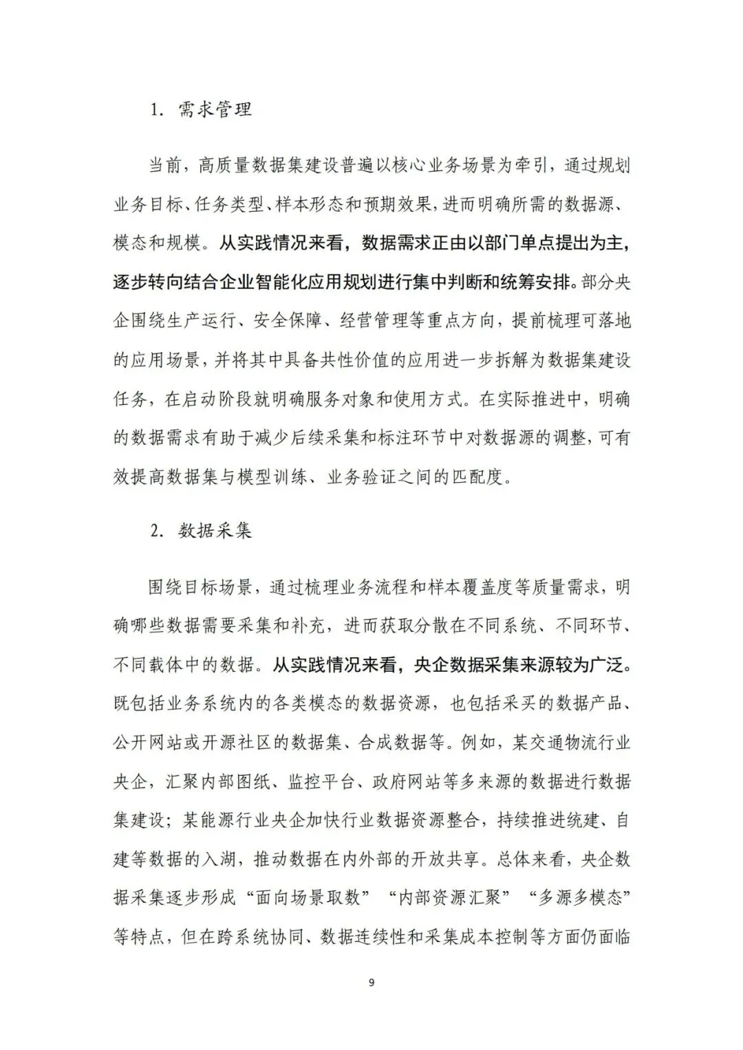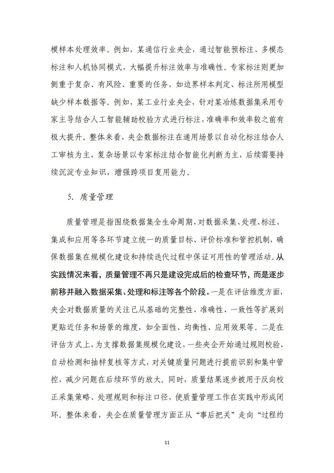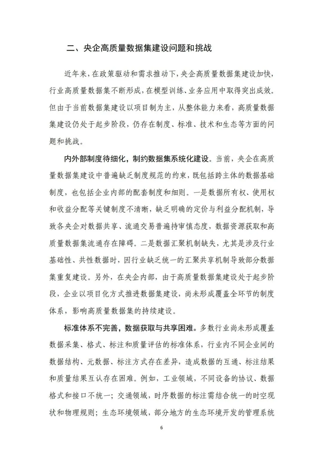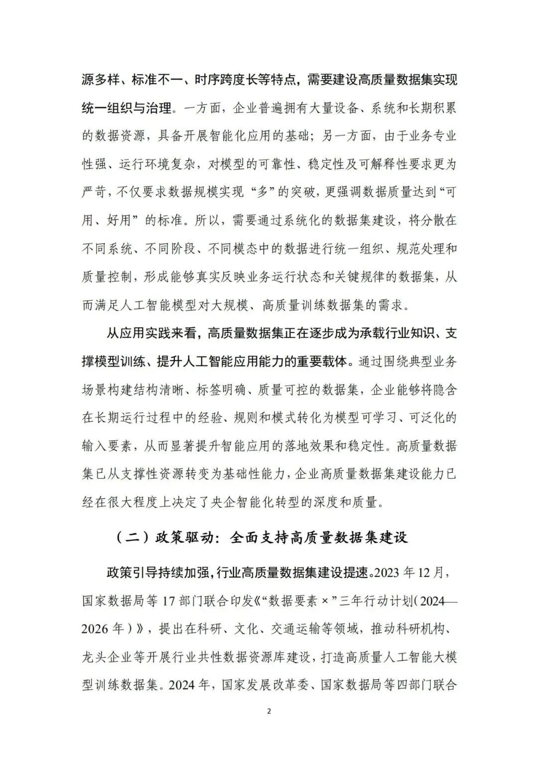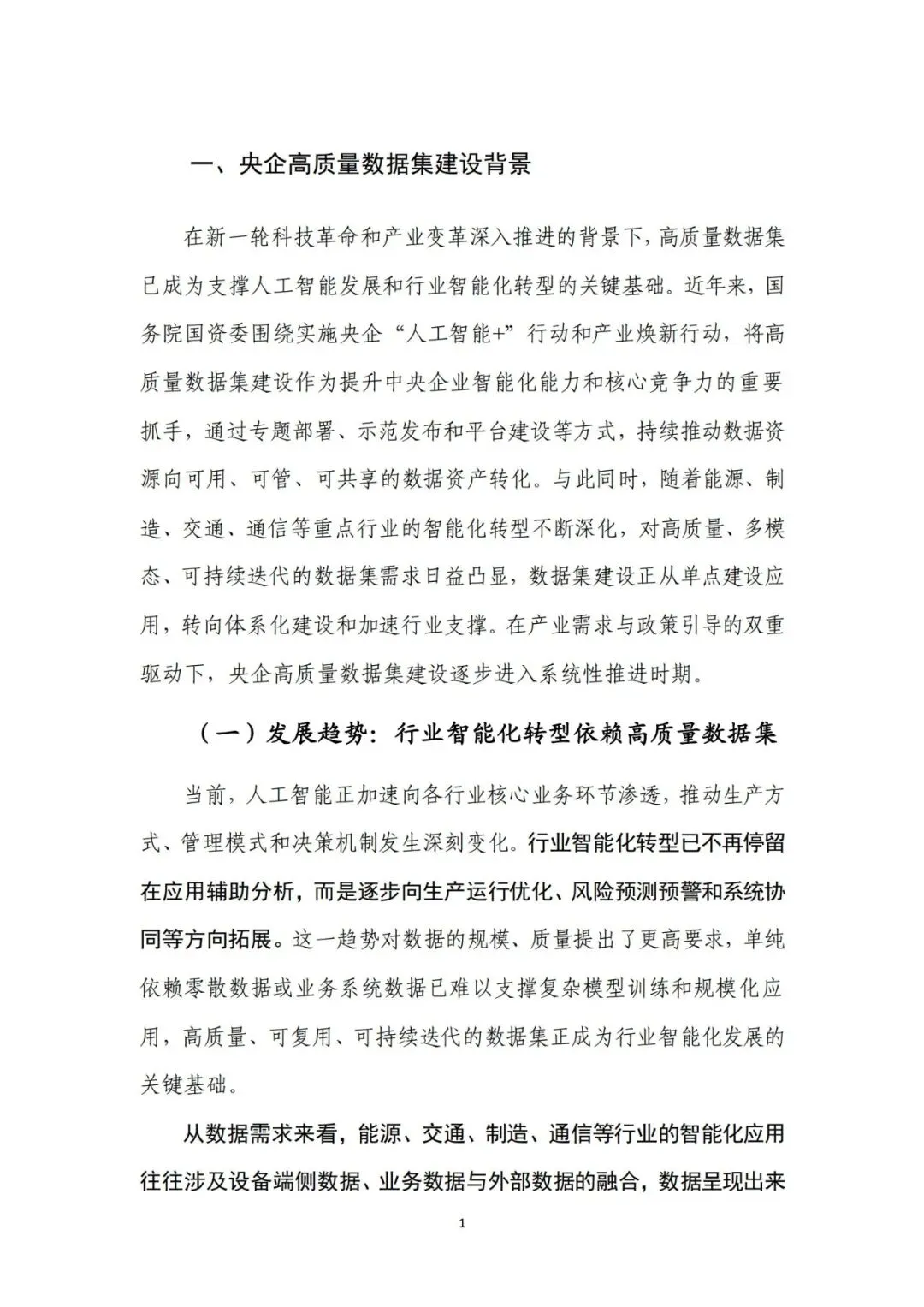 来源:中电数据产业集团有 限公司、中国信息通信研究院在新一轮科技革命和产业变革深入推进的背景下,高质量数据集 已成为支撑人工智能发展和行业智能化转型的关键基础。近年来,国 务院国资委围绕实施央企“人工智能+”行动和产业焕新行动,将高 质量数据集建设作为提升中央企业智能化能力和核心竞争力的重要 抓手,通过专题部署、示范发布和平台建设等方式,持续推动数据资 源向可用、可管、可共享的数据资产转化。与此同时,随着能源、制 造、交通、通信等重点行业的智能化转型不断深化,对高质量、多模 态、可持续迭代的数据集需求日益凸显,数据集建设正从单点建设应 用,转向体系化建设和加速行业支撑。在产业需求与政策引导的双重 驱动下,央企高质量数据集建设逐步进入系统性推进时期。当前,人工智能正加速向各行业核心业务环节渗透,推动生产方 式、管理模式和决策机制发生深刻变化。行业智能化转型已不再停留 在应用辅助分析,而是逐步向生产运行优化、风险预测预警和系统协 同等方向拓展。这一趋势对数据的规模、质量提出了更高要求,单纯 依赖零散数据或业务系统数据已难以支撑复杂模型训练和规模化应 用,高质量、可复用、可持续迭代的数据集正成为行业智能化发展的 关键基础。从应用实践来看,高质量数据集正在逐步成为承载行业知识、支 撑模型训练、提升人工智能应用能力的重要载体。通过围绕典型业务 场景构建结构清晰、标签明确、质量可控的数据集,企业能够将隐含 在长期运行过程中的经验、规则和模式转化为模型可学习、可泛化的 输入要素,从而显著提升智能应用的落地效果和稳定性。高质量数据 集已从支撑性资源转变为基础性能力,企业高质量数据集建设能力已 经在很大程度上决定了央企智能化转型的深度和质量。内外部制度待细化,制约数据集系统化建设。当前,央企在高质 量数据集建设中普遍缺乏制度规范的约束,既包括跨主体的数据基础 制度,也包括企业内部的配套制度和细则。一是数据所有权、使用权 和收益分配等关键制度不清晰,缺乏明确的定价与利益分配机制,导 致各央企对数据共享、流通交易普遍持审慎态度,数据资源获取和高 质量数据集流通存在障碍。二是数据汇聚机制缺失,尤其是涉及行业 基础性、共性数据时,因行业缺乏统一的汇聚共享机制导致部分数据 集重复建设。另外,在央企内部,由于高质量数据集建设处于起步阶 段,企业以项目化方式推进数据集建设,尚未形成覆盖全环节的制度 体系,影响高质量数据集的持续建设。技术支撑能力不足,影响建设效率和效果。技术架构方面,尽管 部分央企已搭建数据平台,具备数据标注、质量评估等工具,但数据 采集、处理、标注、评估、应用全过程不打通,容易造成开发、标注 等过程难以追溯、验证和迭代。数据处理方面,缺乏面向非结构化、 多模态数据的智能数据处理工具,导致多模态数据的结构和特征提取 能力不足,非结构化数据的联合建模可用性较差。数据标注方面,部 分数据标注工具对BIM模型、影像等非结构化数据的标注效率较低, 影响构建效率。质量评估方面,质量评估常作为事后环节开展,而非 贯穿于采集、处理、标注等各阶段,导致系统无法实现对采集偏差、 标注错误、样本分布失衡等问题的即时发现与修正。