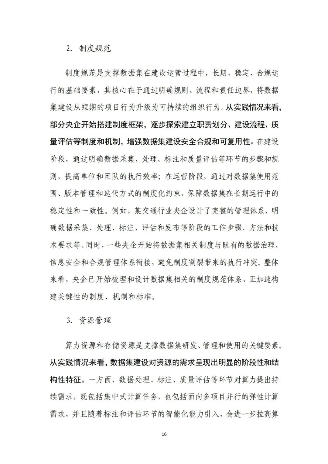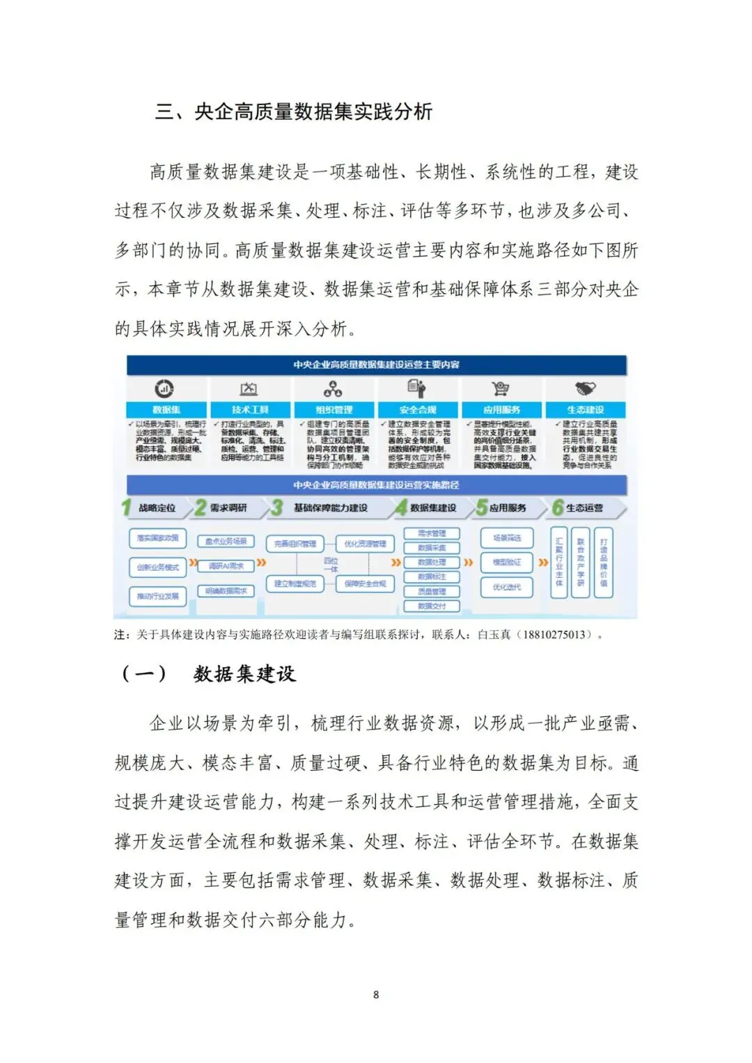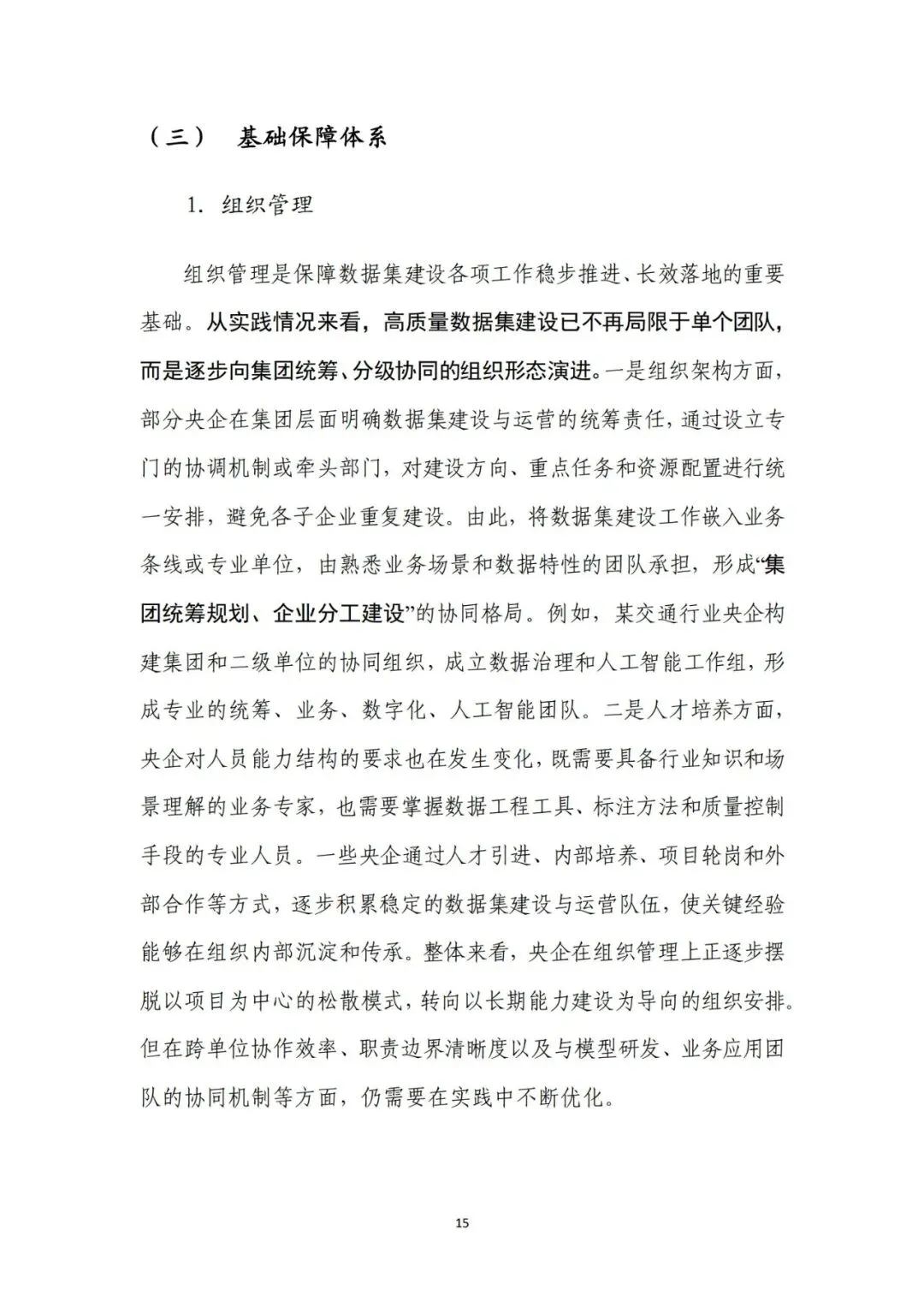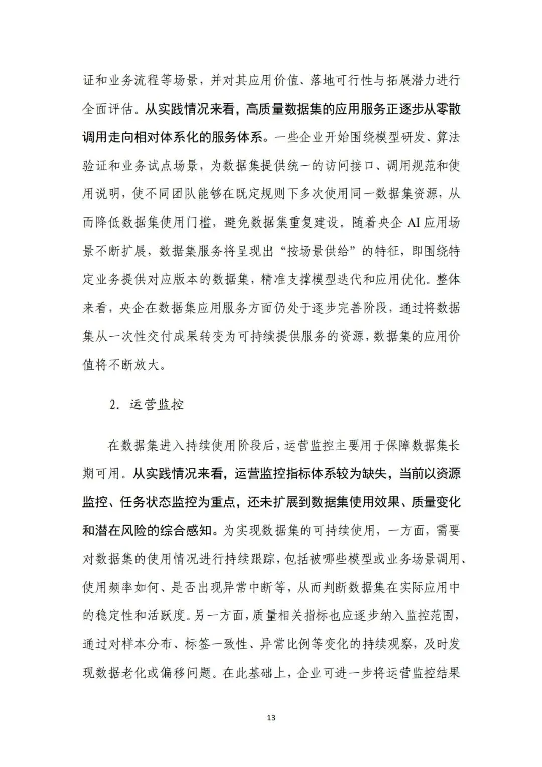 来源:中电数据产业集团有 限公司、中国信息通信研究院在新一轮科技革命和产业变革深入推进的背景下,高质量数据集 已成为支撑人工智能发展和行业智能化转型的关键基础。近年来,国 务院国资委围绕实施央企“人工智能+”行动和产业焕新行动,将高 质量数据集建设作为提升中央企业智能化能力和核心竞争力的重要 抓手,通过专题部署、示范发布和平台建设等方式,持续推动数据资 源向可用、可管、可共享的数据资产转化。与此同时,随着能源、制 造、交通、通信等重点行业的智能化转型不断深化,对高质量、多模 态、可持续迭代的数据集需求日益凸显,数据集建设正从单点建设应 用,转向体系化建设和加速行业支撑。在产业需求与政策引导的双重 驱动下,央企高质量数据集建设逐步进入系统性推进时期。当前,人工智能正加速向各行业核心业务环节渗透,推动生产方 式、管理模式和决策机制发生深刻变化。行业智能化转型已不再停留 在应用辅助分析,而是逐步向生产运行优化、风险预测预警和系统协 同等方向拓展。这一趋势对数据的规模、质量提出了更高要求,单纯 依赖零散数据或业务系统数据已难以支撑复杂模型训练和规模化应 用,高质量、可复用、可持续迭代的数据集正成为行业智能化发展的 关键基础。从应用实践来看,高质量数据集正在逐步成为承载行业知识、支 撑模型训练、提升人工智能应用能力的重要载体。通过围绕典型业务 场景构建结构清晰、标签明确、质量可控的数据集,企业能够将隐含 在长期运行过程中的经验、规则和模式转化为模型可学习、可泛化的 输入要素,从而显著提升智能应用的落地效果和稳定性。高质量数据 集已从支撑性资源转变为基础性能力,企业高质量数据集建设能力已 经在很大程度上决定了央企智能化转型的深度和质量。内外部制度待细化,制约数据集系统化建设。当前,央企在高质 量数据集建设中普遍缺乏制度规范的约束,既包括跨主体的数据基础 制度,也包括企业内部的配套制度和细则。一是数据所有权、使用权 和收益分配等关键制度不清晰,缺乏明确的定价与利益分配机制,导 致各央企对数据共享、流通交易普遍持审慎态度,数据资源获取和高 质量数据集流通存在障碍。二是数据汇聚机制缺失,尤其是涉及行业 基础性、共性数据时,因行业缺乏统一的汇聚共享机制导致部分数据 集重复建设。另外,在央企内部,由于高质量数据集建设处于起步阶 段,企业以项目化方式推进数据集建设,尚未形成覆盖全环节的制度 体系,影响高质量数据集的持续建设。技术支撑能力不足,影响建设效率和效果。技术架构方面,尽管 部分央企已搭建数据平台,具备数据标注、质量评估等工具,但数据 采集、处理、标注、评估、应用全过程不打通,容易造成开发、标注 等过程难以追溯、验证和迭代。数据处理方面,缺乏面向非结构化、 多模态数据的智能数据处理工具,导致多模态数据的结构和特征提取 能力不足,非结构化数据的联合建模可用性较差。数据标注方面,部 分数据标注工具对BIM模型、影像等非结构化数据的标注效率较低, 影响构建效率。质量评估方面,质量评估常作为事后环节开展,而非 贯穿于采集、处理、标注等各阶段,导致系统无法实现对采集偏差、 标注错误、样本分布失衡等问题的即时发现与修正。