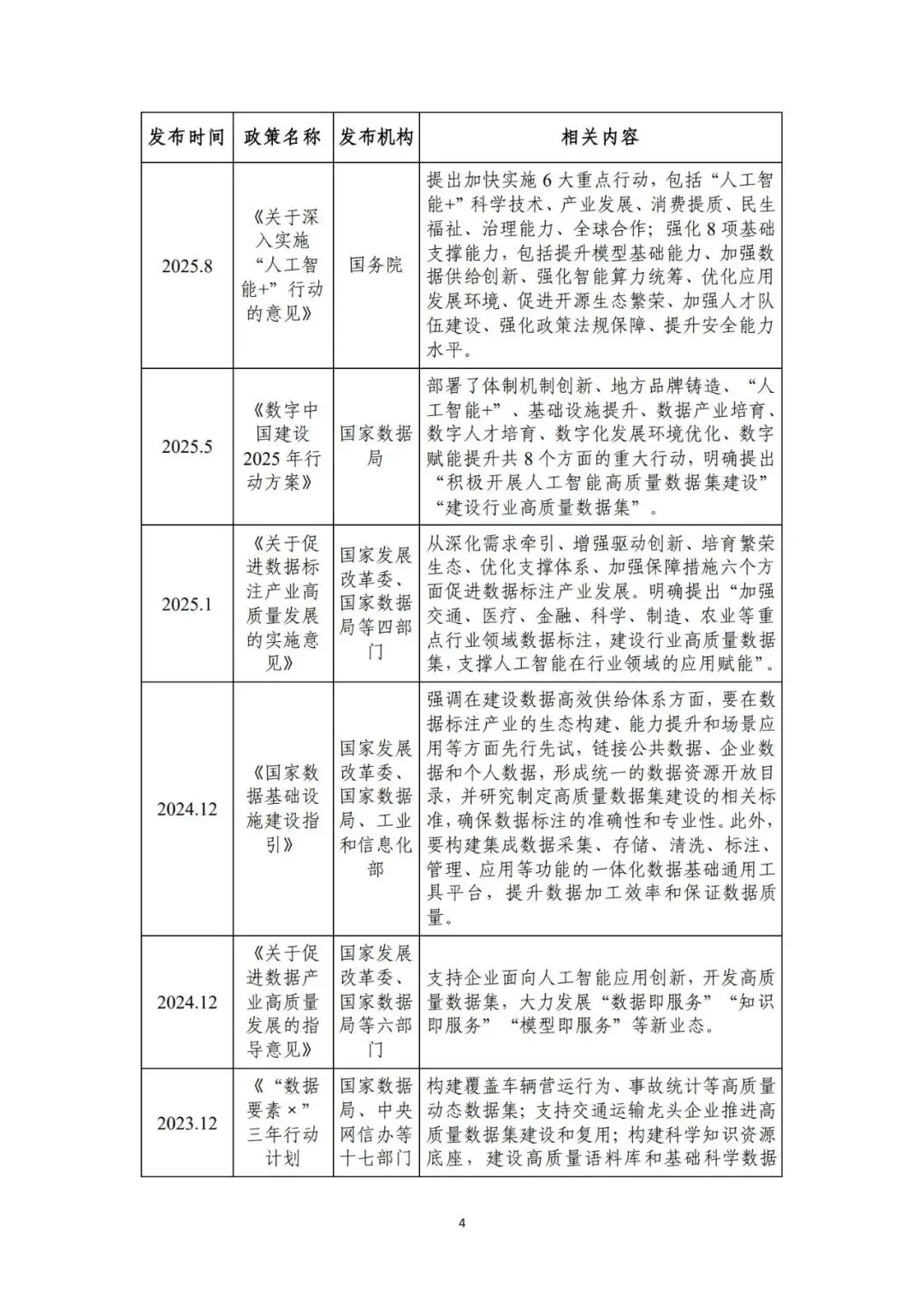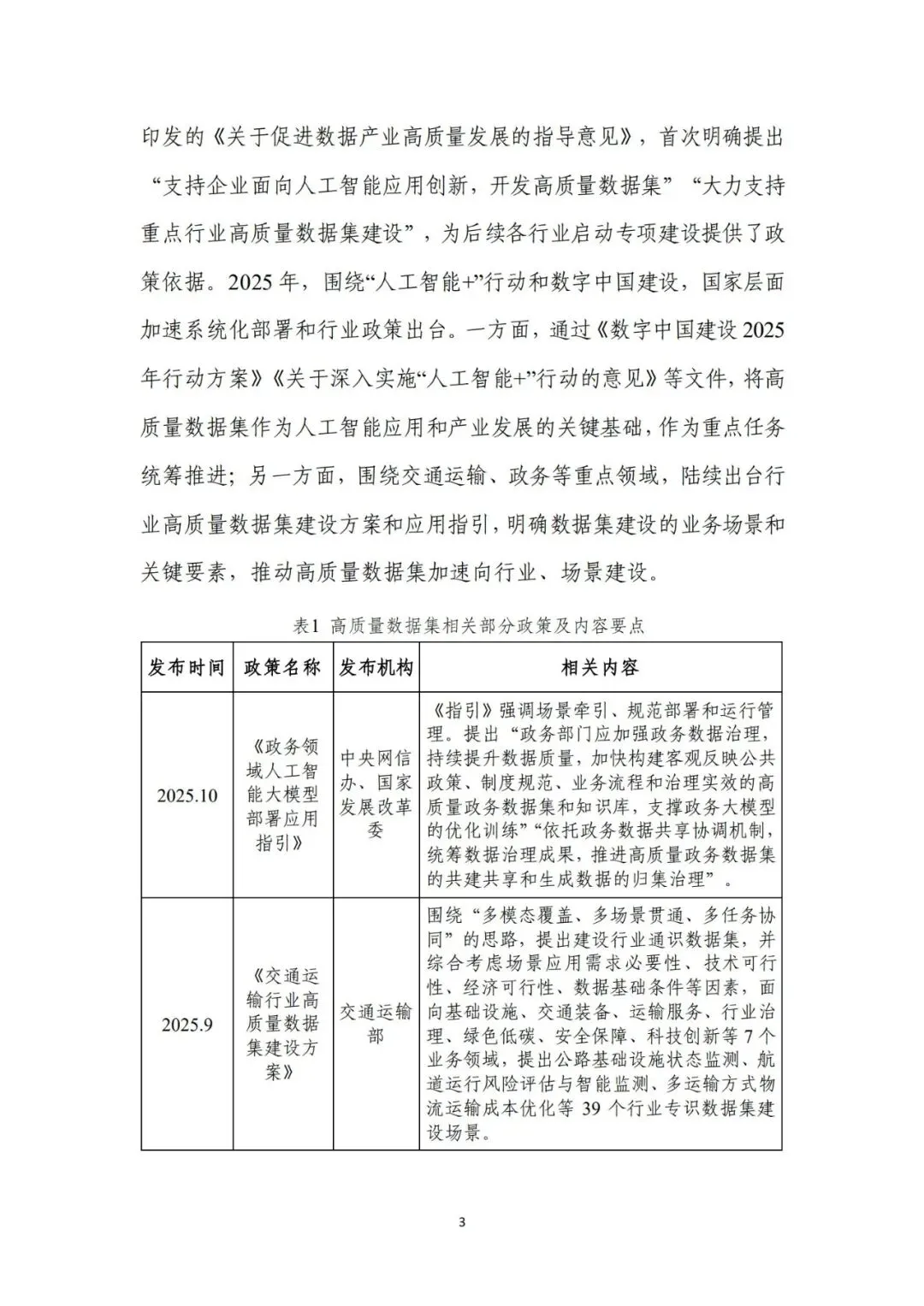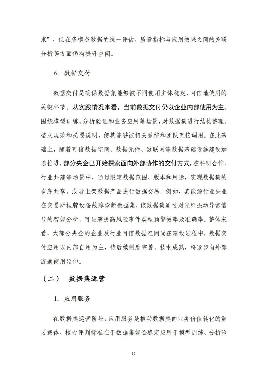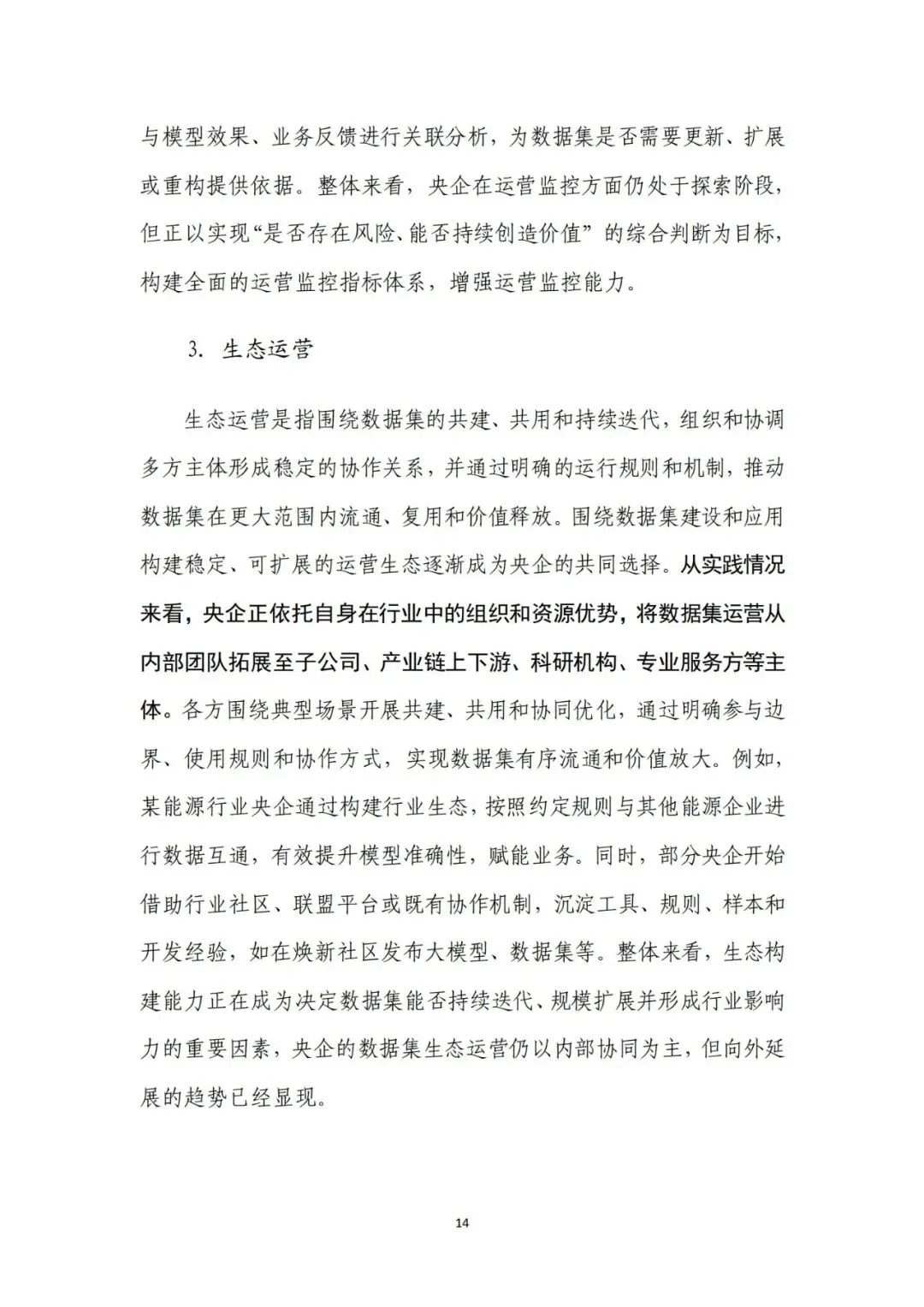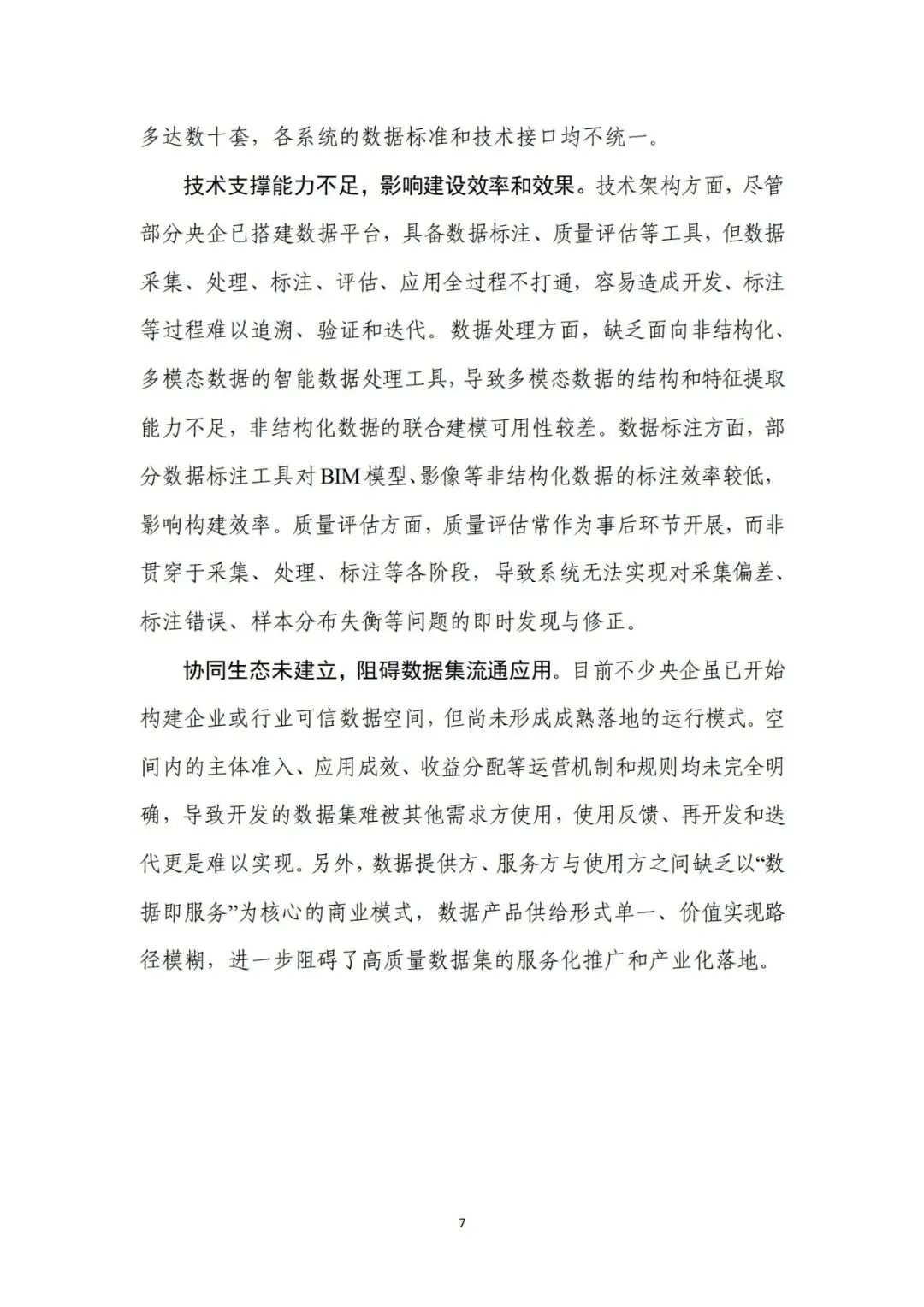 来源:中电数据产业集团有 限公司、中国信息通信研究院在新一轮科技革命和产业变革深入推进的背景下,高质量数据集 已成为支撑人工智能发展和行业智能化转型的关键基础。近年来,国 务院国资委围绕实施央企“人工智能+”行动和产业焕新行动,将高 质量数据集建设作为提升中央企业智能化能力和核心竞争力的重要 抓手,通过专题部署、示范发布和平台建设等方式,持续推动数据资 源向可用、可管、可共享的数据资产转化。与此同时,随着能源、制 造、交通、通信等重点行业的智能化转型不断深化,对高质量、多模 态、可持续迭代的数据集需求日益凸显,数据集建设正从单点建设应 用,转向体系化建设和加速行业支撑。在产业需求与政策引导的双重 驱动下,央企高质量数据集建设逐步进入系统性推进时期。当前,人工智能正加速向各行业核心业务环节渗透,推动生产方 式、管理模式和决策机制发生深刻变化。行业智能化转型已不再停留 在应用辅助分析,而是逐步向生产运行优化、风险预测预警和系统协 同等方向拓展。这一趋势对数据的规模、质量提出了更高要求,单纯 依赖零散数据或业务系统数据已难以支撑复杂模型训练和规模化应 用,高质量、可复用、可持续迭代的数据集正成为行业智能化发展的 关键基础。从应用实践来看,高质量数据集正在逐步成为承载行业知识、支 撑模型训练、提升人工智能应用能力的重要载体。通过围绕典型业务 场景构建结构清晰、标签明确、质量可控的数据集,企业能够将隐含 在长期运行过程中的经验、规则和模式转化为模型可学习、可泛化的 输入要素,从而显著提升智能应用的落地效果和稳定性。高质量数据 集已从支撑性资源转变为基础性能力,企业高质量数据集建设能力已 经在很大程度上决定了央企智能化转型的深度和质量。内外部制度待细化,制约数据集系统化建设。当前,央企在高质 量数据集建设中普遍缺乏制度规范的约束,既包括跨主体的数据基础 制度,也包括企业内部的配套制度和细则。一是数据所有权、使用权 和收益分配等关键制度不清晰,缺乏明确的定价与利益分配机制,导 致各央企对数据共享、流通交易普遍持审慎态度,数据资源获取和高 质量数据集流通存在障碍。二是数据汇聚机制缺失,尤其是涉及行业 基础性、共性数据时,因行业缺乏统一的汇聚共享机制导致部分数据 集重复建设。另外,在央企内部,由于高质量数据集建设处于起步阶 段,企业以项目化方式推进数据集建设,尚未形成覆盖全环节的制度 体系,影响高质量数据集的持续建设。技术支撑能力不足,影响建设效率和效果。技术架构方面,尽管 部分央企已搭建数据平台,具备数据标注、质量评估等工具,但数据 采集、处理、标注、评估、应用全过程不打通,容易造成开发、标注 等过程难以追溯、验证和迭代。数据处理方面,缺乏面向非结构化、 多模态数据的智能数据处理工具,导致多模态数据的结构和特征提取 能力不足,非结构化数据的联合建模可用性较差。数据标注方面,部 分数据标注工具对BIM模型、影像等非结构化数据的标注效率较低, 影响构建效率。质量评估方面,质量评估常作为事后环节开展,而非 贯穿于采集、处理、标注等各阶段,导致系统无法实现对采集偏差、 标注错误、样本分布失衡等问题的即时发现与修正。