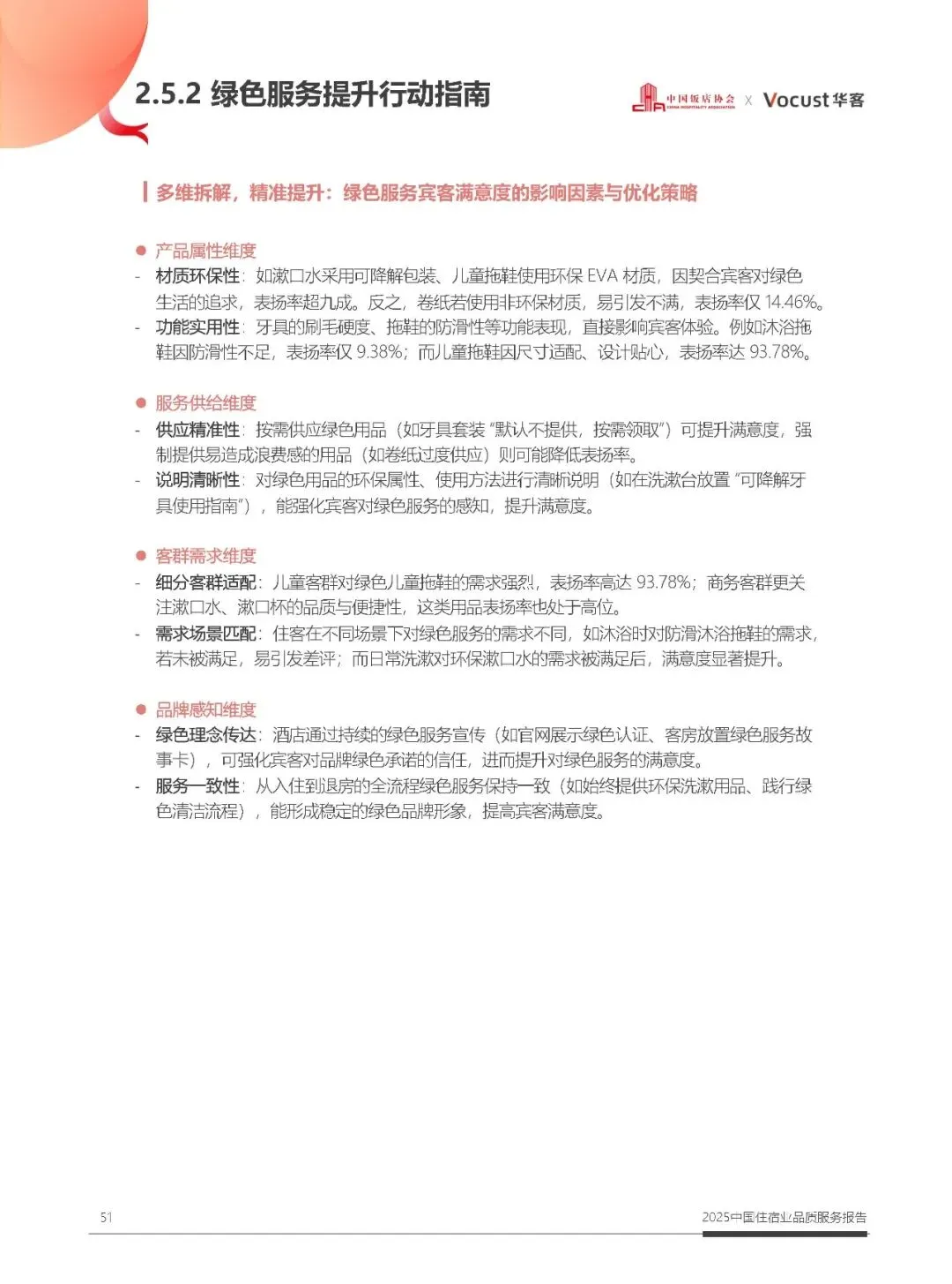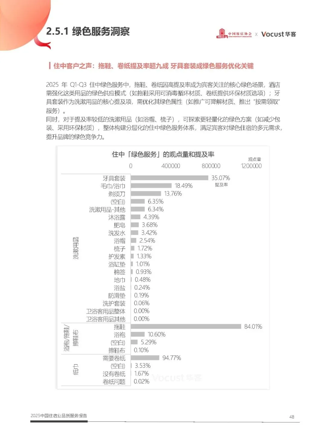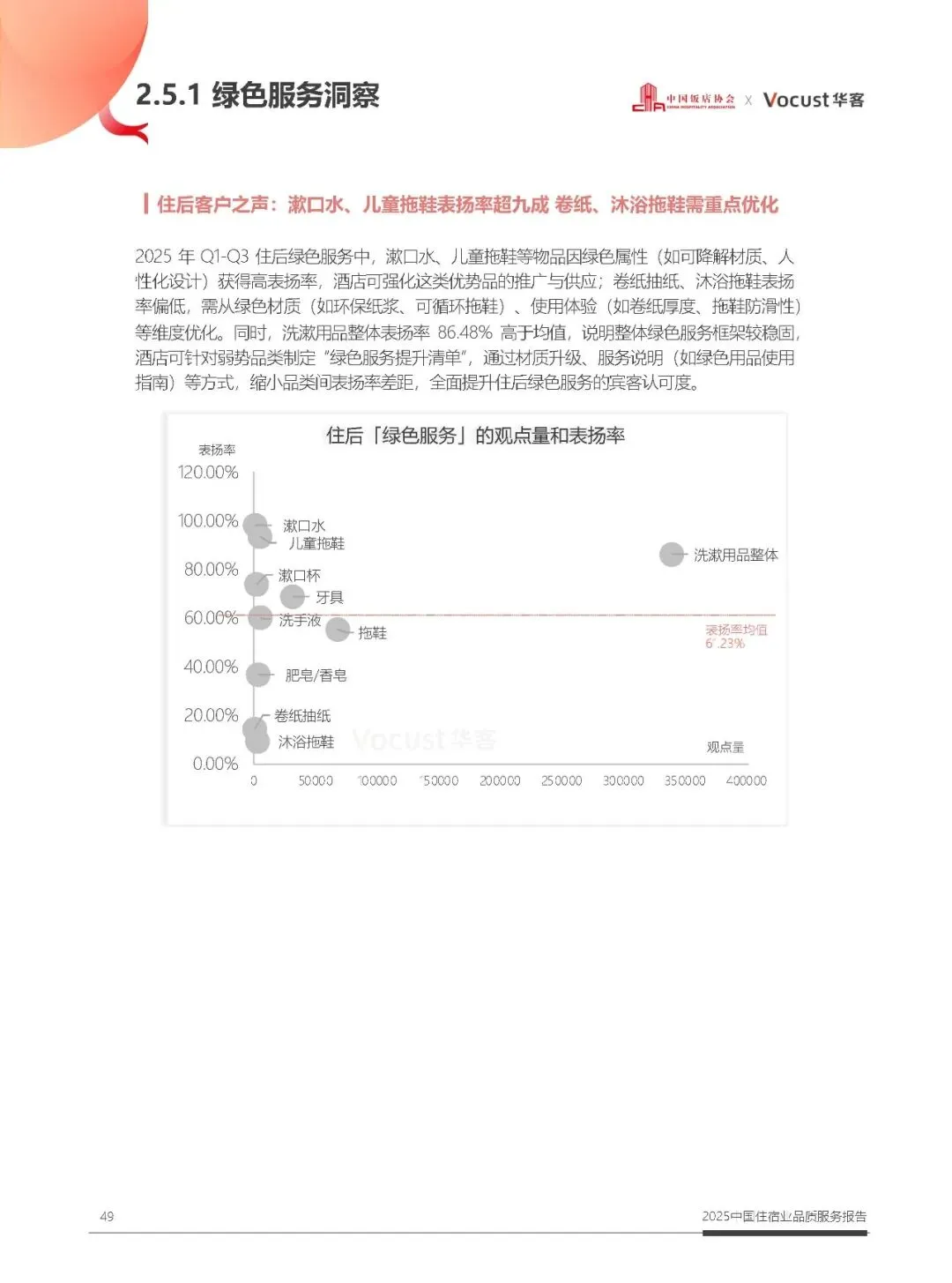 绿色服务和餐饮创新,正在成为新的加分项。客房节水节电、反对餐饮浪费的普及度已经到了 98%,但减塑去塑还只有 80% 的提及度。游客对绿色服务的态度很实在,漱口水、儿童拖鞋这种实用的绿色用品,表扬率超 90%,但卷纸、沐浴拖鞋的表扬率才 14.46%。