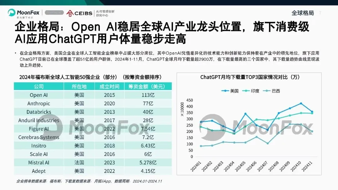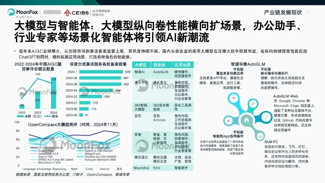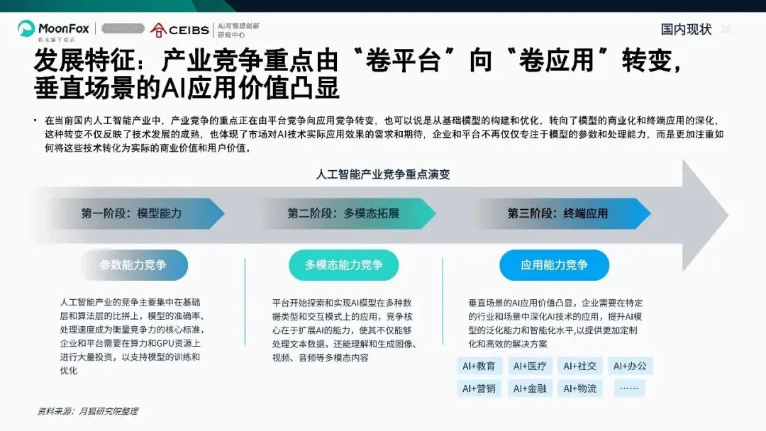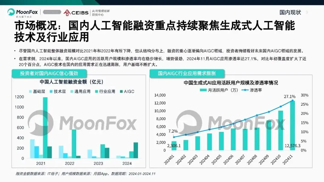 报告指出,全球AI市场持续保持高速增长,投资活跃度显著回温。美国在融资和应用市场仍占主导,但中国在大模型数量、AIGC应用渗透率等方面展现出强劲追赶势头。数据显示(来源:月狐iApp等),2024年国内AIGC应用渗透率大幅提升,用户基础迅速扩大,产业竞争重点正从“卷平台”转向“卷应用”,垂直场景的AI价值日益凸显。