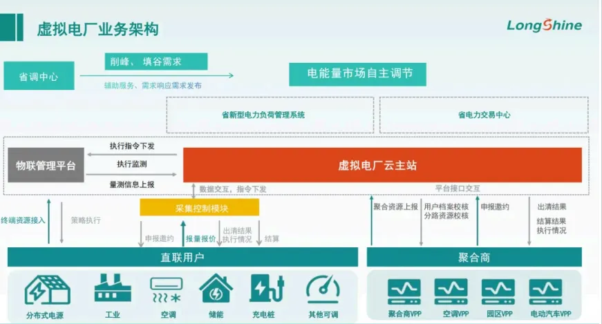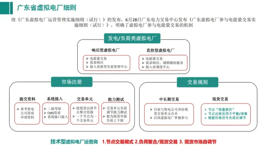 该报告围绕广东虚拟电厂参与电力市场的盈利逻辑与运营体系展开,核心内容可分为五部分。首先,明确业务架构与市场机制:虚拟电厂通过云主站、物联管理平台等实现与省调中心、交易中心的数据交互,承接削峰填谷、辅助服务等需求,聚合分布式电源、储能、充电桩等可调资源;广东相关细则明确了虚拟电厂参与电能量交易、需求响应等的注册流程与交易规则,区分响应型、直控型等类型。
