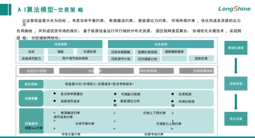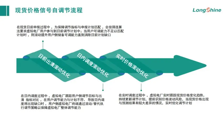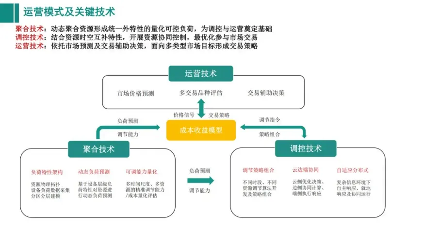然后,阐述技术支撑与运营流程:以聚合、调控、运营三大技术为核心,通过 AI 算法实现负荷画像、可调潜力评估与交易策略优化,形成日前、日内、实时的全流程滚动优化机制。