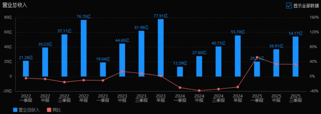 2025年三季度的营业总收入为54.17亿元,相较于2024年三季度的40.73亿元,同比增长33.00%。