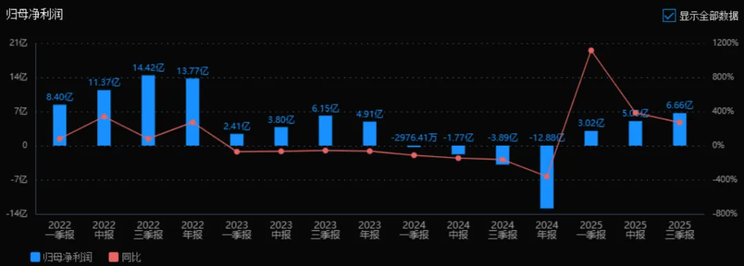 2025年三季度的归母净利润为6.66亿元,相较于2024年三季度的-3.89亿元,同比增长271.17%。