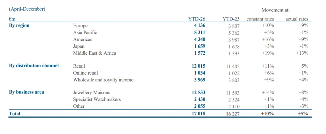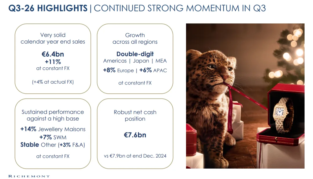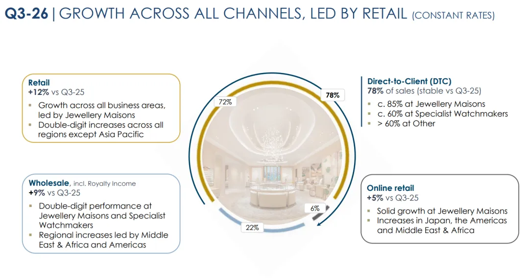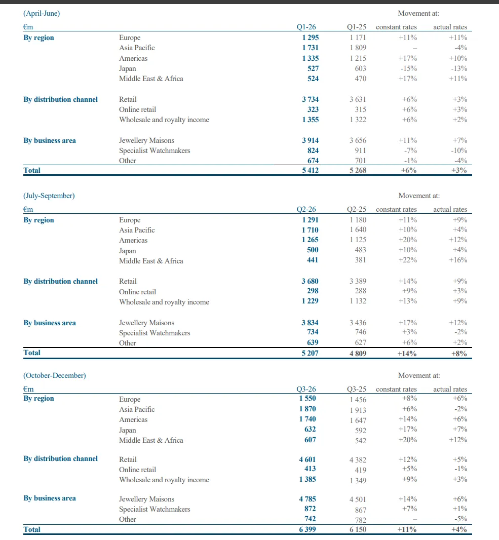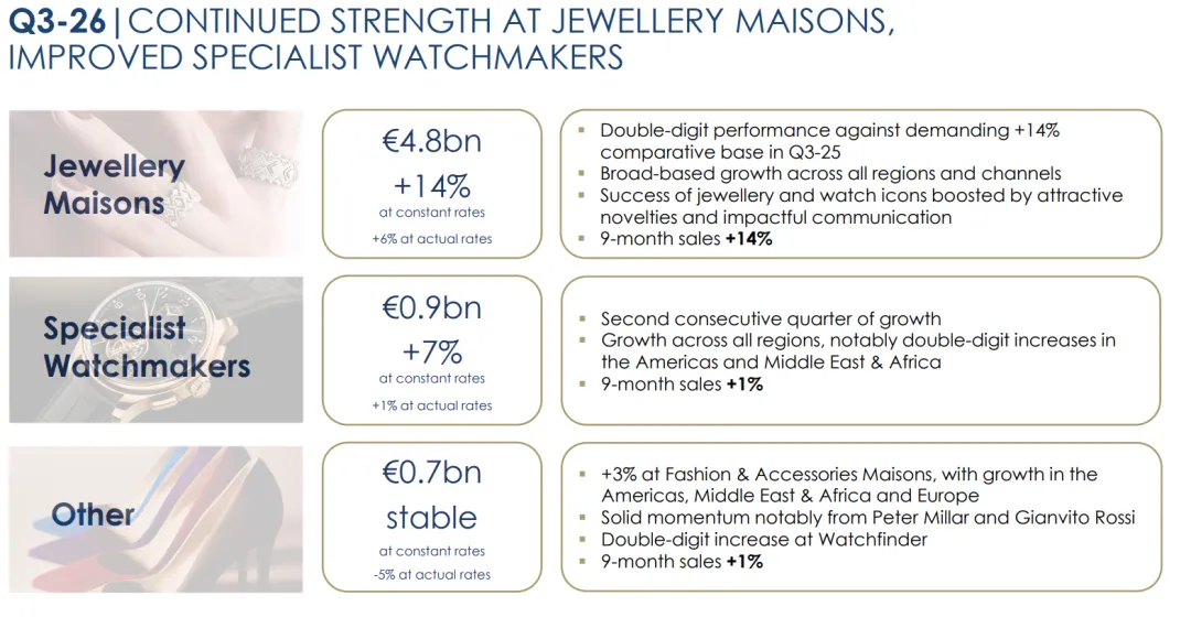 26年Q3收入为64亿欧元增长固定汇率11%,其中珠宝增长14%,手表增长7%,其它增长3%;