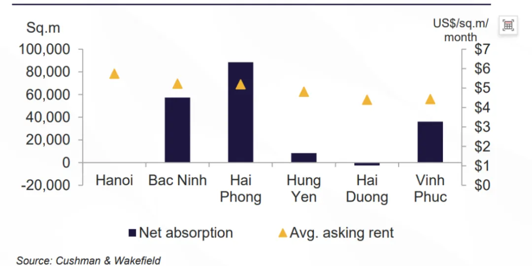 2025至2027年期间,嘉平国际机场的启用以及北部市场新增约85.6万平方米的新建标准厂房供应,以上这些措施将会进一步巩固北部作为重点发展区域的地位。短期内,位于扩建后的安凤工业园的Frasers项目将于年内交付使用,而Sembcorp在海防的项目也已正式动工,预计第一阶段将于2025年第三季度投入运营,届时将为市场新增约10万平方米的厂房租赁面积。