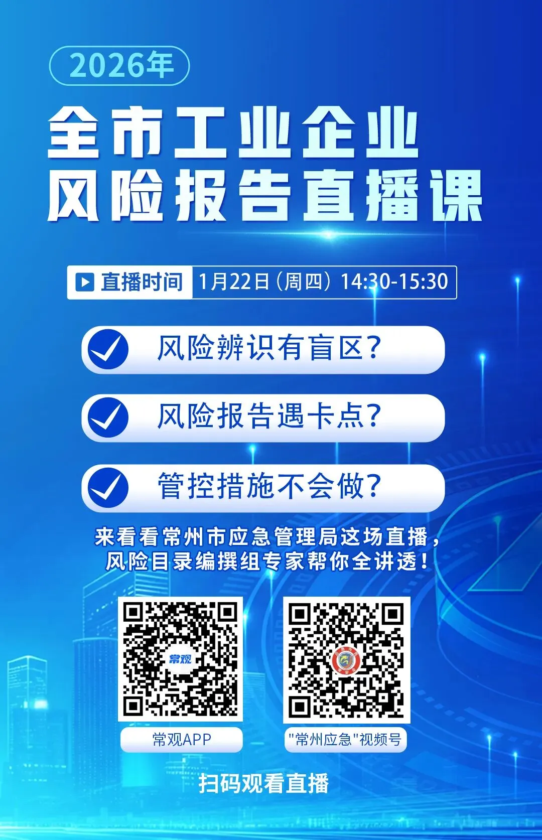 市应急管理局将于1月22日下午2点半,在“常州应急”视频号和“常观”APP直播2026年全市工业企业风险报告培训课,深入解读企业容易遗漏、容易忽视的较大以上风险,并提供风险防控措施。