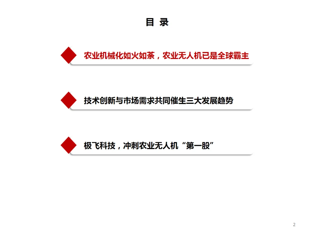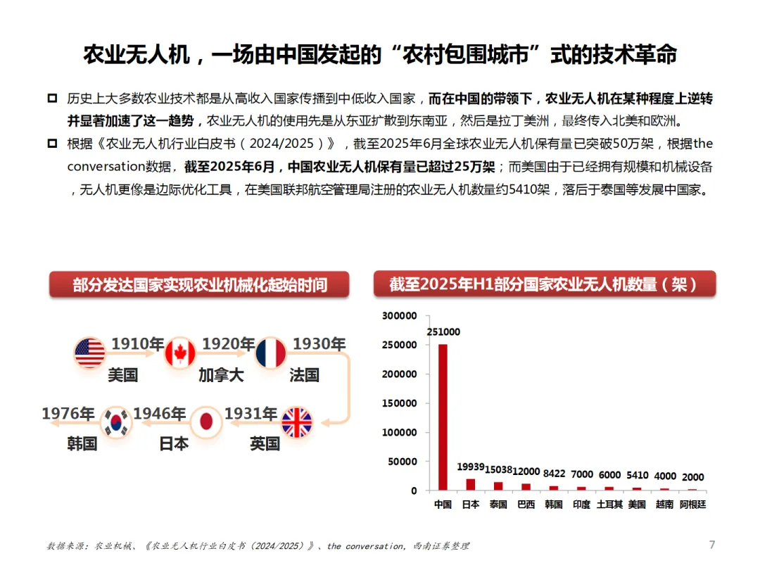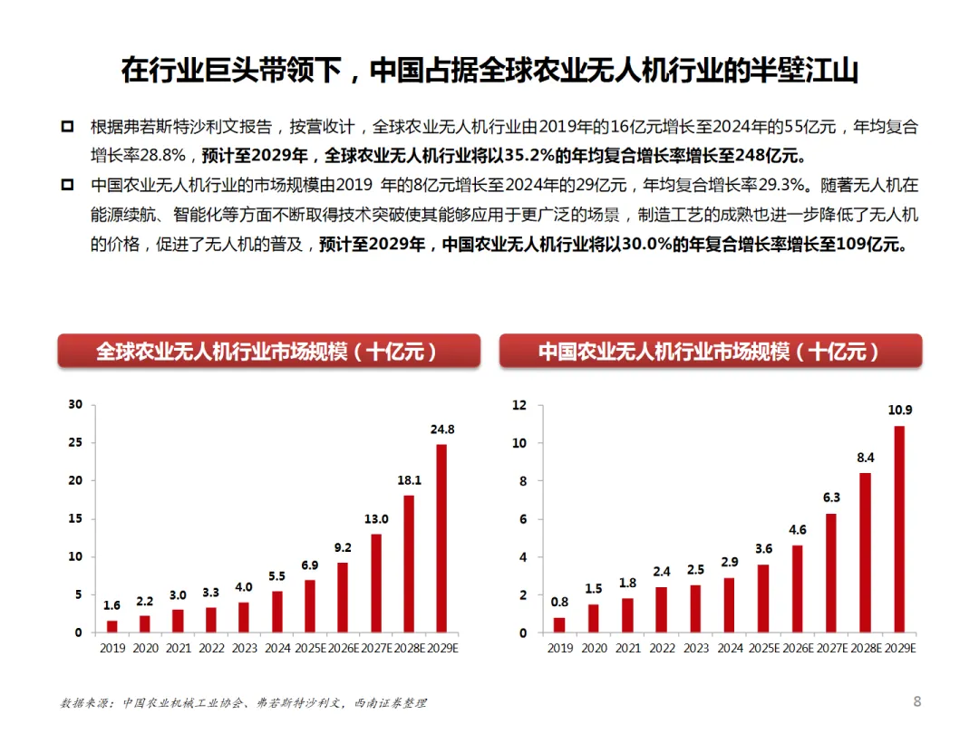 本篇行业报告可以通过扫下方知识星球下载。39元就可以下载星球所有报告。免费提供报告查找服务。随着全球农业机械化的推进,农业无人机市场迎来了快速发展。中国企业在这一领域的表现尤为突出,不仅在国内市场占有率高,而且在国际市场上也展现出强大的竞争力。中国农业无人机市场的发展得益于政策的支持和技术创新。中国政府通过农机购置补贴等措施,大力推动农业机械化发展。2024年,中央财政安排了246亿元支持农机购置与应用补贴,这一数字创下了历史新高。在这样的政策环境下,中国农业无人机市场规模迅速增长,预计到2029年将以30.0%的年复合增长率增长至109亿元。在全球市场上,中国农业无人机企业同样表现不俗。根据《农业无人机行业白皮书(2024/2025)》,截至2025年6月,中国农业无人机保有量已超过25万架,占全球总量的一半以上。中国企业如大疆和极飞科技在全球农业无人机行业中占据领先地位,两者合计市占率超过95%。极飞科技作为行业的佼佼者,其发展历程和市场表现值得关注。公司成立于2007年,经过多年的深耕,已经构建起全链条产品体系,产品进化成农田智能机器人矩阵,在全球农业机器人领域取得领先地位。2025年9月,极飞科技提交港股IPO申请,正式冲刺港交所,有望成为“农业无人机第一股”。极飞科技的成功得益于其在技术创新和市场需求的双重推动下,不断优化产品和供应链管理。公司累计研发投入5.92亿元,通过核心零部件的全链条自主能力,实现了研发降本。旗舰农业无人飞机价格的大幅下降,推动了农业无人飞机成为农业生产的刚需工具。随着规模的增长和成本的压缩,公司毛利率得到大幅提升,从2022年的17.9%上升至2025年上半年的34.3%,销售净利率也从-42%飙升至17.5%。总体来看,中国农业无人机企业在全球市场上的领先地位,不仅得益于国内政策的支持,更在于企业自身的技术创新和市场拓展能力。随着技术的不断进步和市场的进一步开拓,中国农业无人机企业有望在全球市场上取得更大的成功。免责声明:以上分享报告为公开合法渠道获得,内容大部分来源于网络,版权归原作者所有,如有侵权,请及时与我们联系,我们将第一时间保障您的权益。推荐内容仅供参考学习,不构成投资建议。