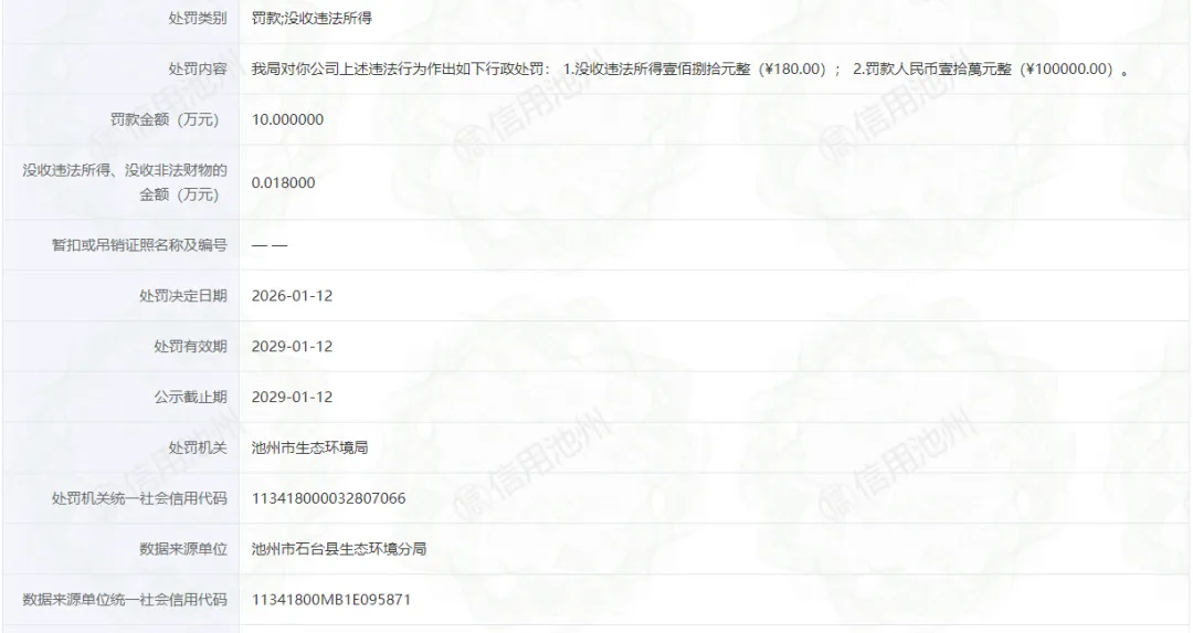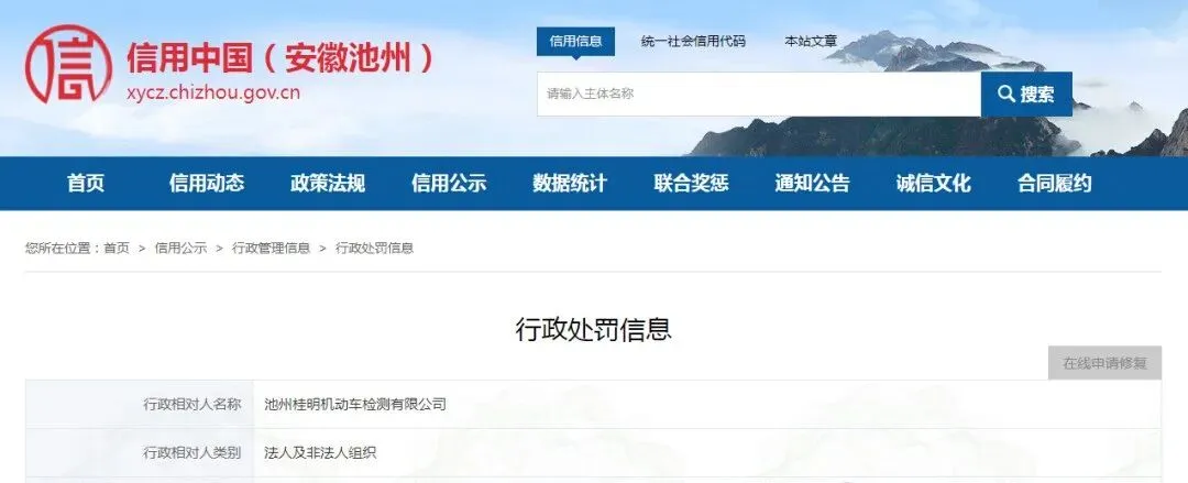 近日,信用池州披露行政处罚信息,池州桂明机动车检测有限公司因出具虚假车检报告被当地生态环境部门依法没收违法所得并罚款。行政处罚决定书文号:皖池环﹝石﹞罚﹝2026﹞1号。
