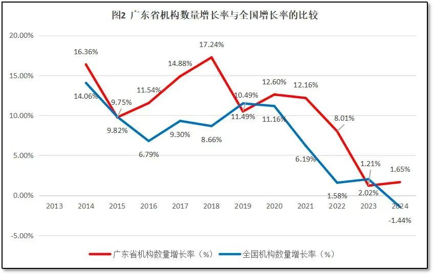 广东省检验检测机构数量增长率与全国检验检测机构数量的增长率进行比较,如图2所示。