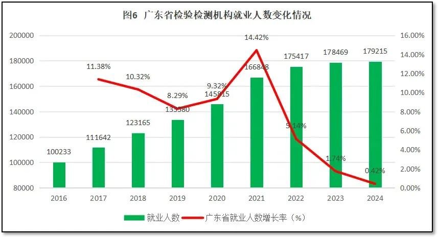 由图6可见,从2016年到2024年,广东省检验检测机就业人口数量从10万人左右增长到17.9万人,年均增速7.63%。就业人口同比增长率在2021年度达到最高峰,为14.42%,之后开始下降,2024年度增长率仅有0.42%,是历年的最低值。