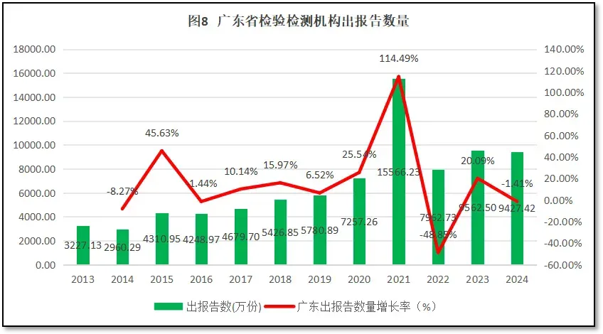 从图8来看,广东省检验检测机构年度对外出具检验检测报告数量总体来说呈现逐年增长的趋势,但在2021年有一个异常增长,当年出具报告数量达到1.56亿份之多,增长率达到114.49%,但次年数据回落到较为合理的区间。2024年度出具报告的数量为9427.42万份,是2013年度数量的2.92倍,较2023年度略有下降。