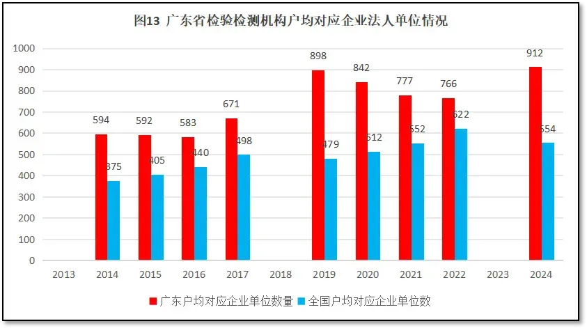 由图13可见,广东省检验检测机构户均对应的企业法人单位数量一直比全国平均水平高,这一方面说明广东地区制造业发达、企业数量众多,对检验检测行业来说市场空间大,还有不少发展机会;另一方面也说明广东省检验检测体系发展质量较好,规模与区域经济的适配程度仍保持在较好的水平。