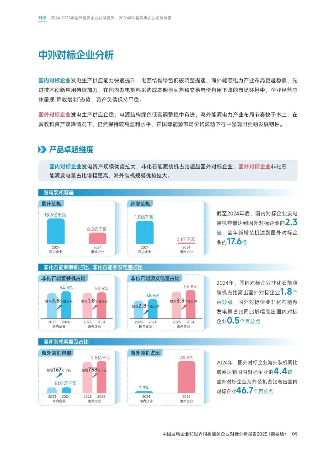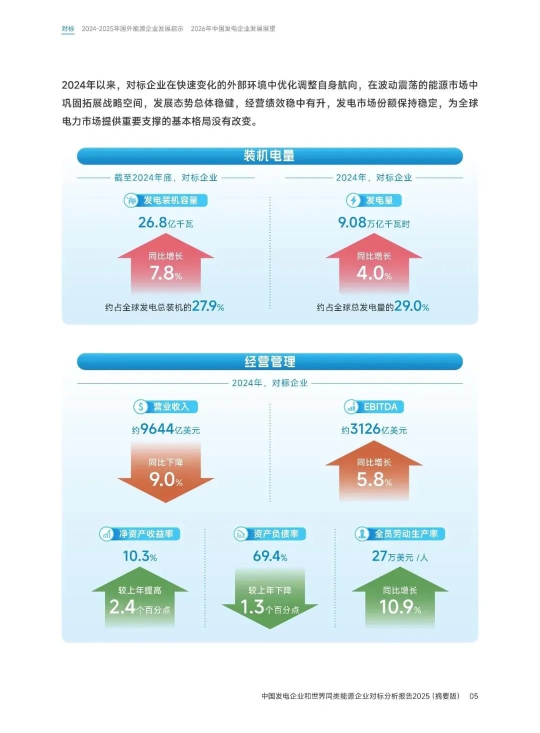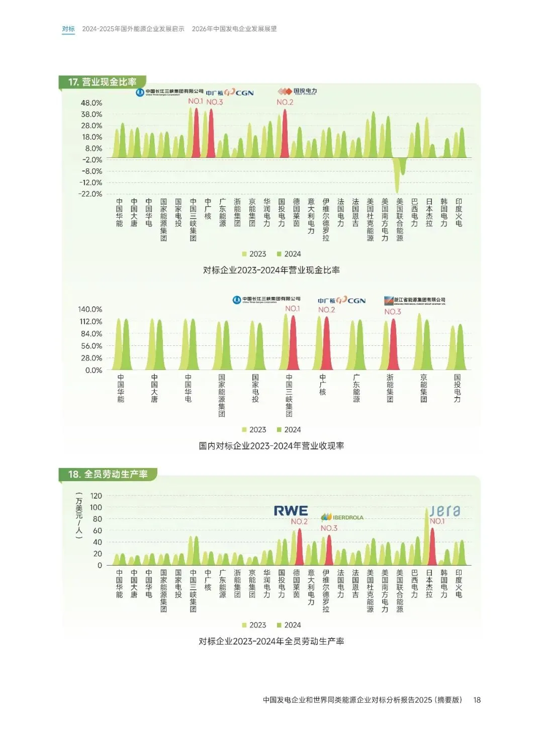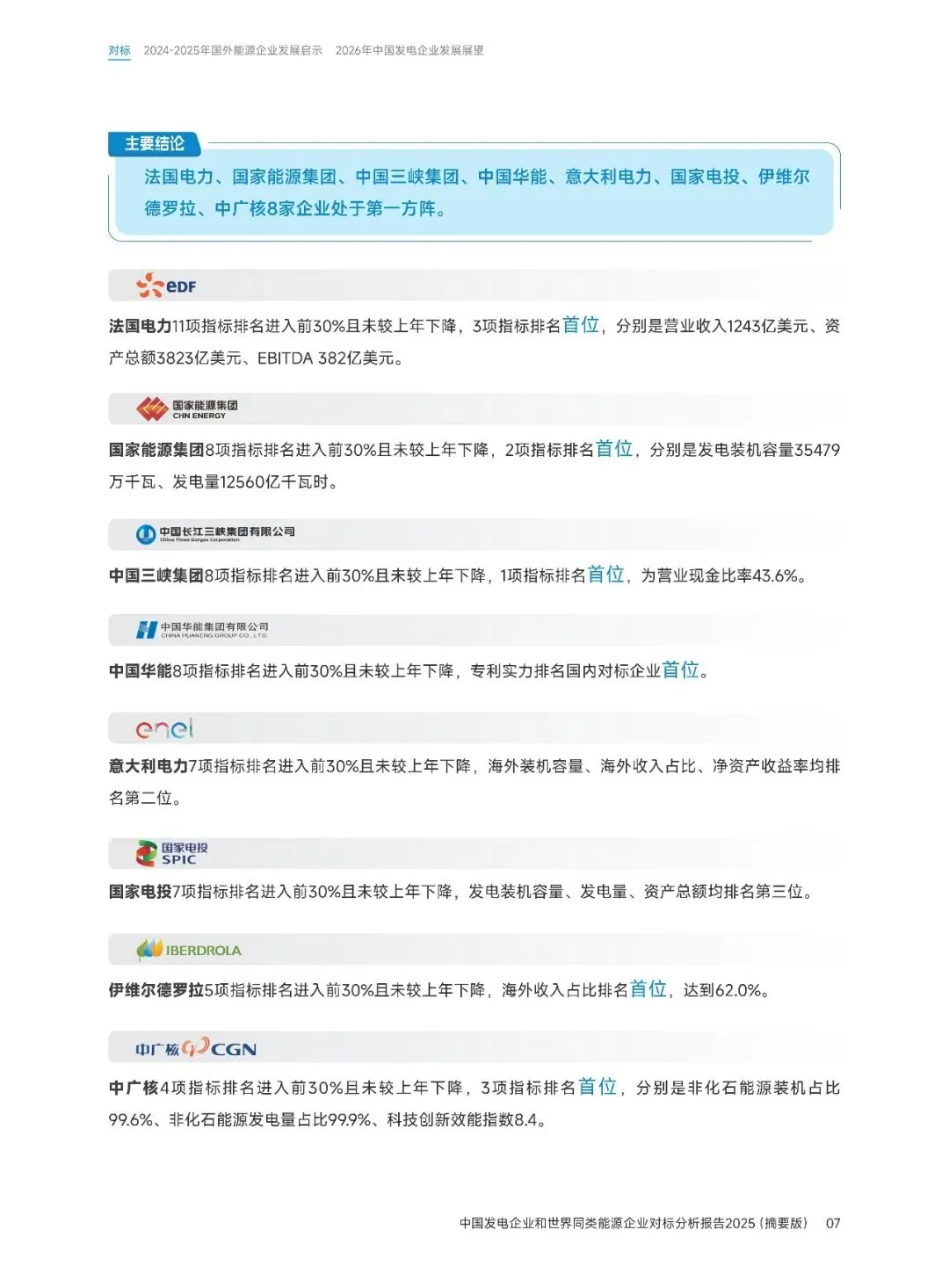 中电联电力发展研究院、中国华能集团能源研究院、中国华电集团法务与风险管理部、国家电投集团经济技术研究院、中国三峡集团法律合规与企业管理部、中国广核集团战略规划部近日联合发布《中国发电企业和世界同类能源企业对标分析报告2025》。