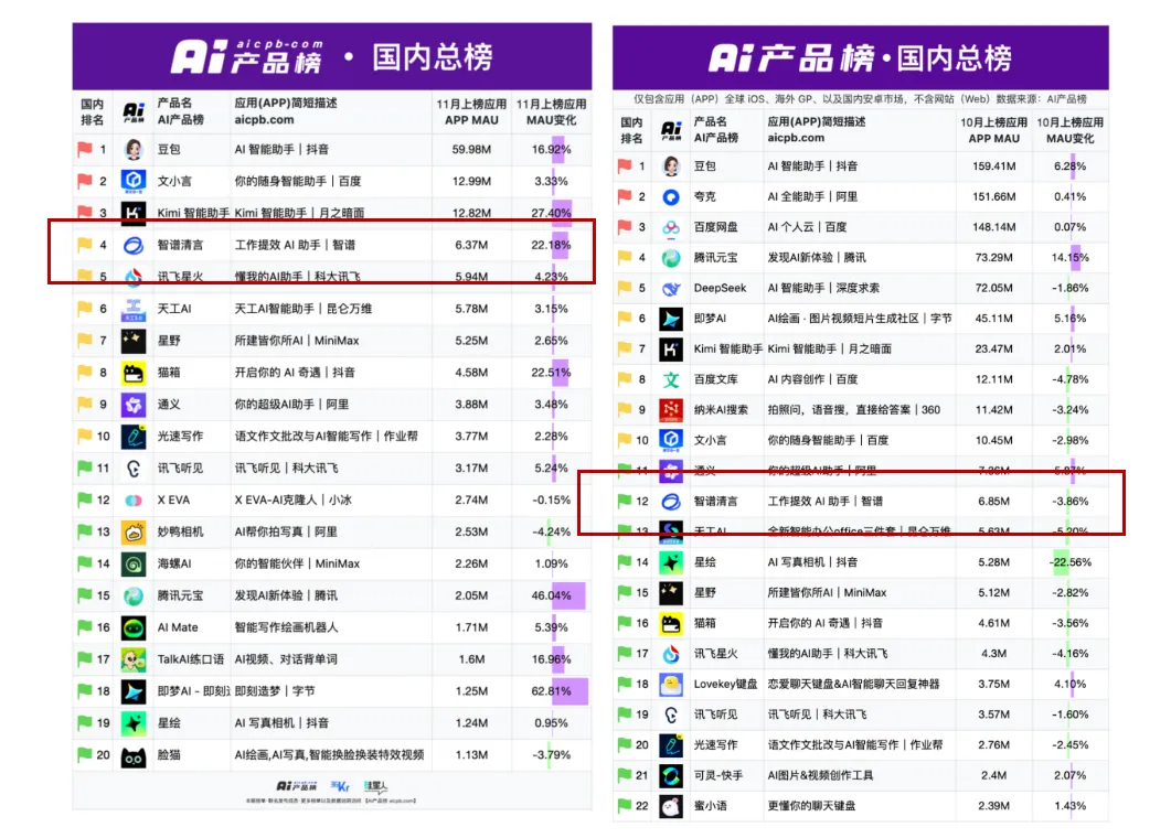 AI国内APP MAU产品榜(左侧是2024年11月榜单,右侧是2025年10月榜单),来源:AI产品榜 aicpb.com