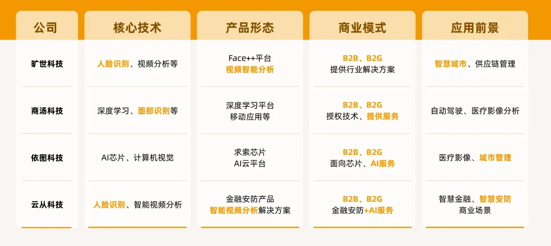 在计算机视觉最辉煌的十年里,四小龙依靠人脸识别技术一度站在中国AI产业的顶点。它们起家于人脸识别算法,那是计算机视觉的“黄金时代”,而且它们的明星科学家创始人更具有光环,很快获得同样连续多轮的融资,当故事讲完投资人要求业绩之时,CV四小龙做出了和今天“AI小龙”同样的选择:大举进军安防、智慧城市、交通、物联网、金融、医疗等B端领域。