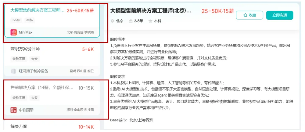 为了满足甲方的安全合规要求、适配甲方充满孤岛的IT架构,最顶尖的AI人才被迫去干“脏活累活”。现在的私有化部署,不仅要卖模型、一体机,还要迁移到云甚至清洗数据。我们从boss直聘看到,能做出让人耳目一新的出海产品talkie的Minimax公司,如今也在招聘“大模型售前解决方案工程师”,分布在北京、上海、深圳。耐人寻味的是,这家公司下面就有老牌外包公司“中软国际”,几乎也是这个职位,只是没有AI,而工资相差数倍,如果前者也在干后者的工作,那么究竟还值不值这个薪资?