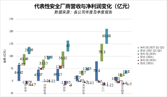 ·2025年业绩分化:进入2025年,市场出现分化。部分企业呈现复苏迹象。例如,根据奇安信2025年三季报,其前三季度营收同比增长4.72%,归母净亏损同比收窄47.54%,第三季度单季实现净利润1.53亿元。三六零前三季度营收同比增长8.18%,亏损也大幅收窄。然而,也有企业仍在调整中,启明星辰2025年前三季度营收同比减少33.46%。